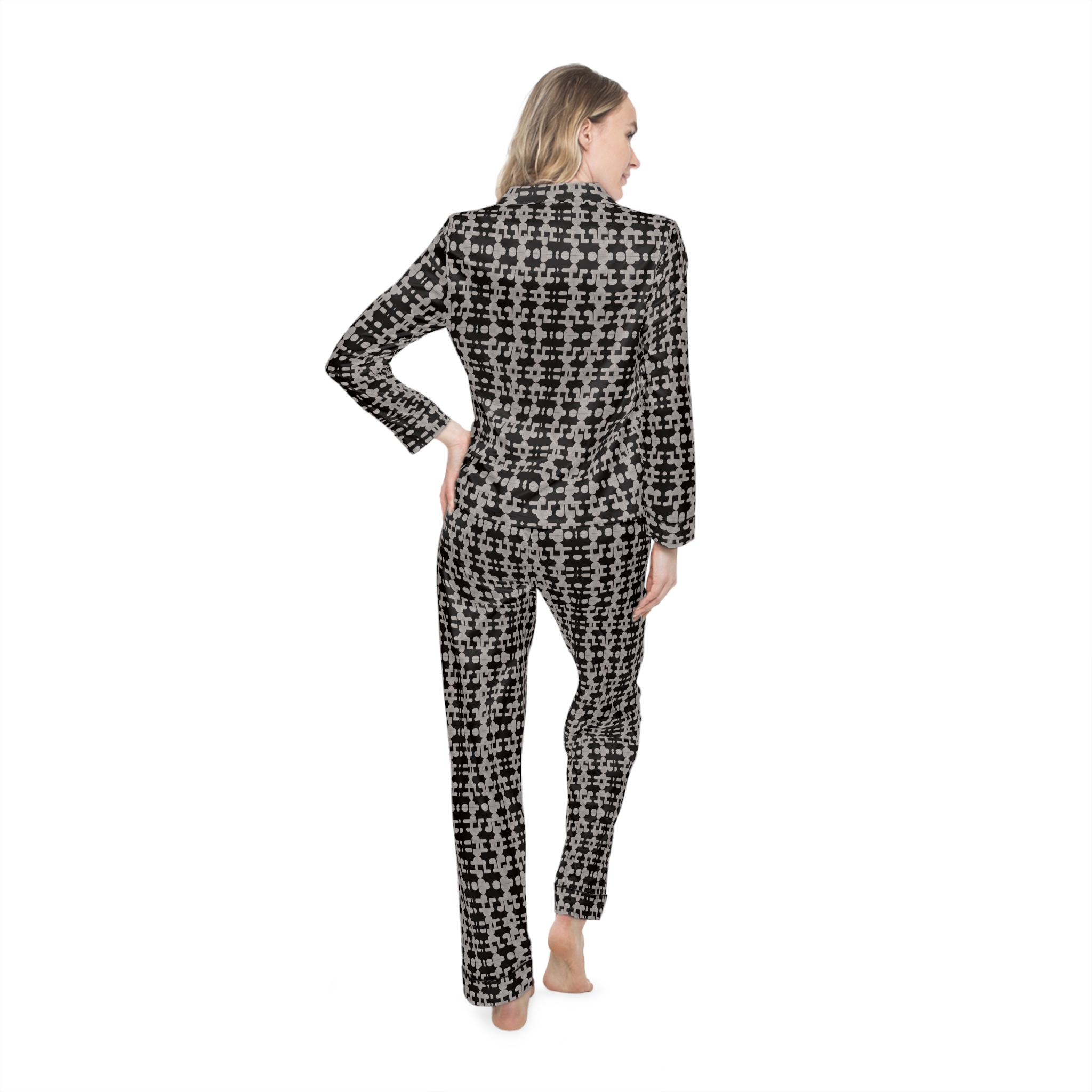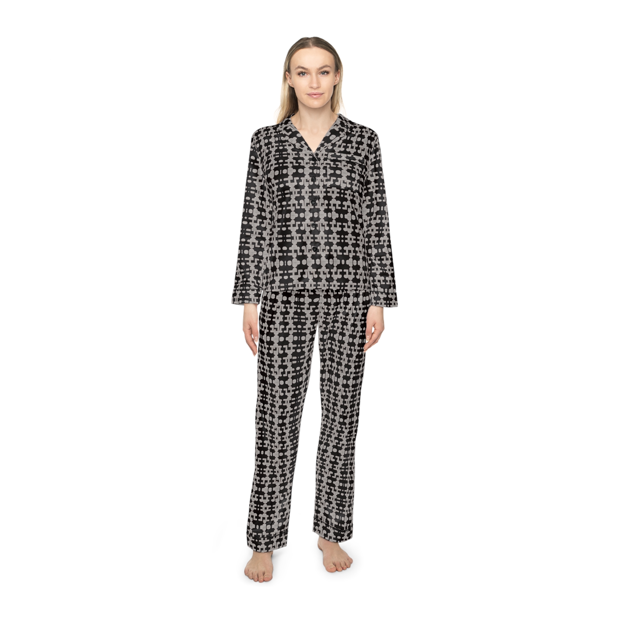 Experience unmatched comfort and elevated design with Hampton Laze designer pyjamas (also known as pajamas). Crafted from a premium satin blend of 95% polyester and 5% spandex, these limited-edition sets feel luxuriously smooth against the skin. Each set features a refined notch lapel collar, black trim details, and a drawstring waist for a tailored yet relaxed fit. Every design is exclusive to Hampton Laze — bold, timeless, and never mass-produced. Perfect for women who value originality, softness, and style, whether lounging or traveling.
