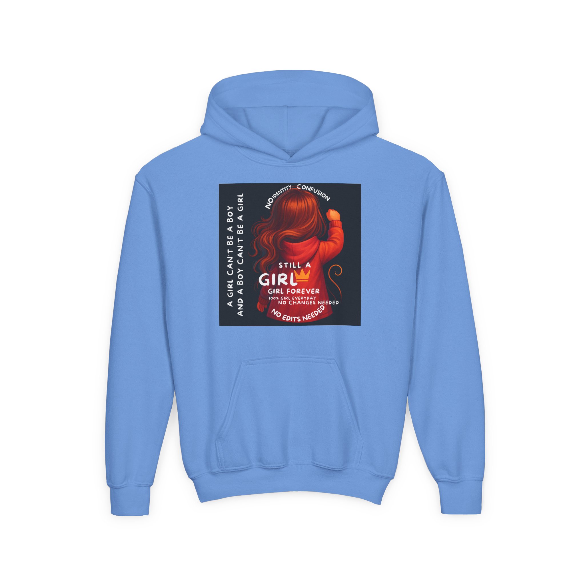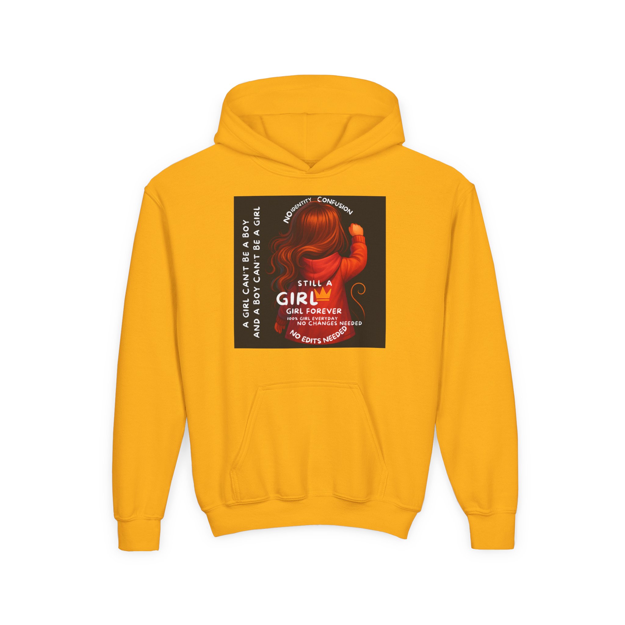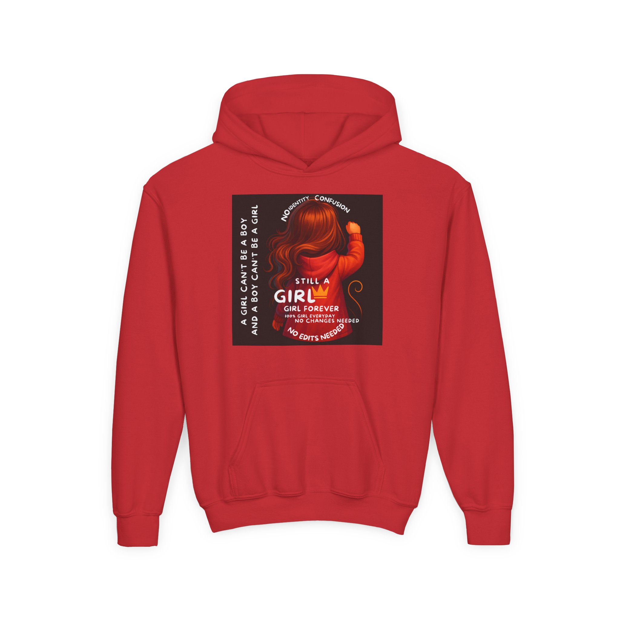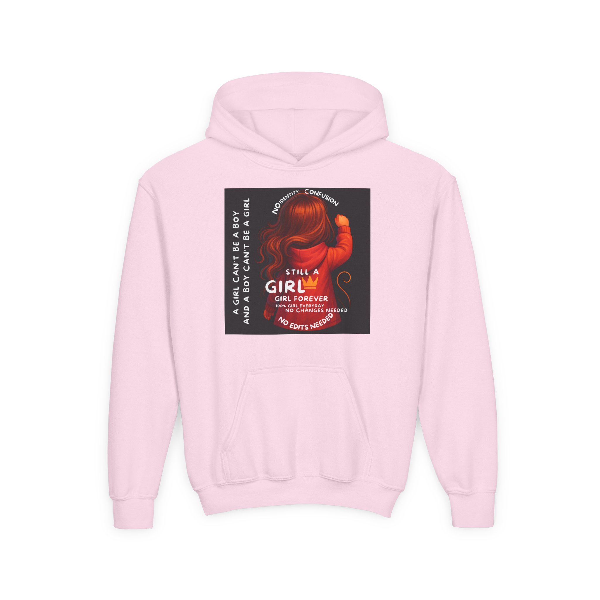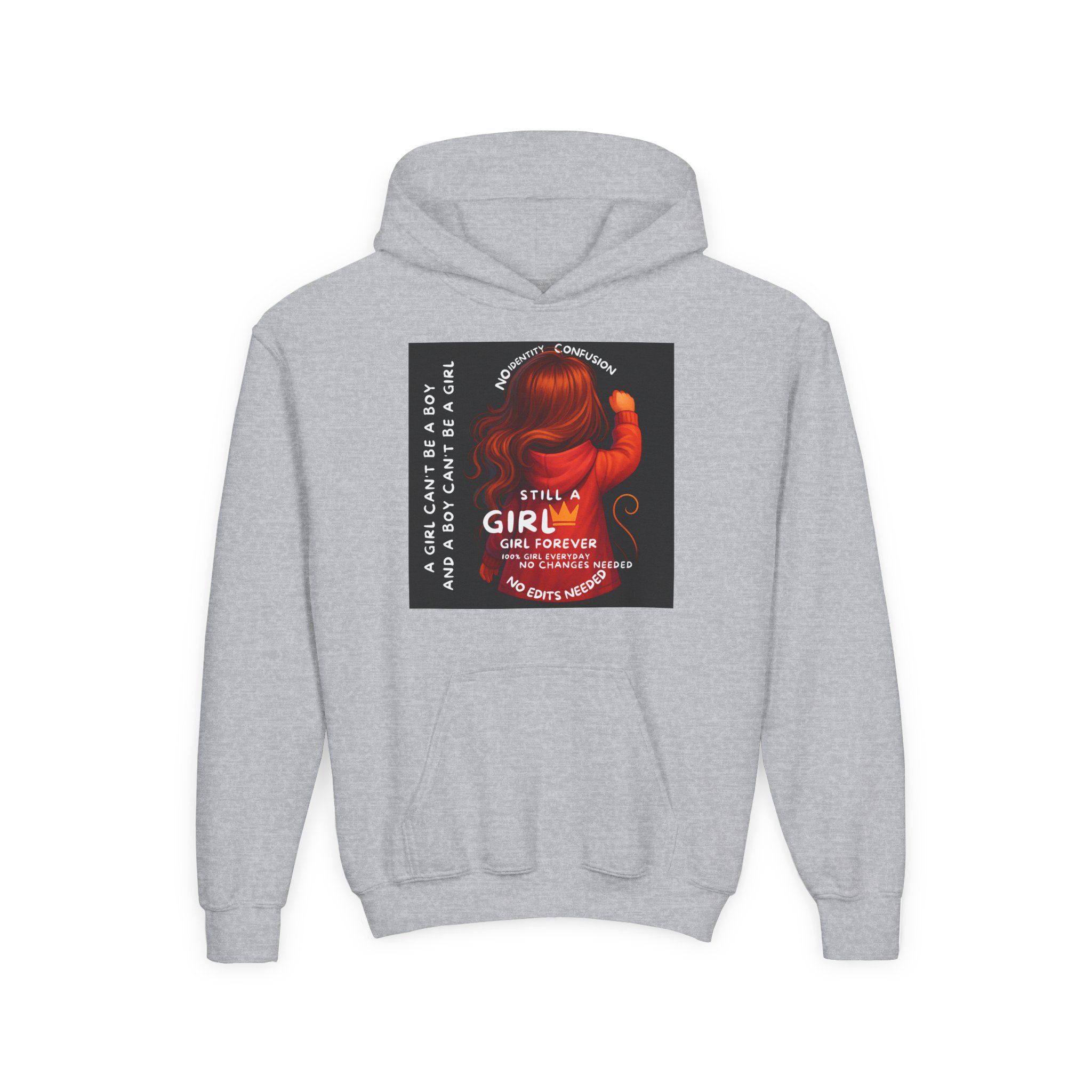 Girl Kids Hoodie – Sweatshirt, Boy is not a Girl and Girl is not a Boy design, Youth Fashion, Birthday Gift, Everyday Wear. Stay cozy and stylish with this comfortable Youth Heavy Blend Hooded Sweatshirt. Perfect for children, this hoodie features adorable designs that promote fun conversations about identity. Ideal for casual outings, school events, or simply lounging at home, it brings a cheerful vibe to any day. The spacious kangaroo pocket adds a touch of practicality, keeping little hands warm while providing a convenient space for storing small treasures. Great for birthdays, back-to-school, or any celebration where kids want to express themselves! Product features – Twill necktape for comfort and stability – Spacious kangaroo pouch pocket – Durable 50% cotton, 50% polyester blend – Embroidery option available for customization – Regular fit that runs true to size Care instructions – Machine wash: warm (max 40C or 105F) – Bleach as needed – Tumble dry: medium heat – Do not dry clean – Do not iron