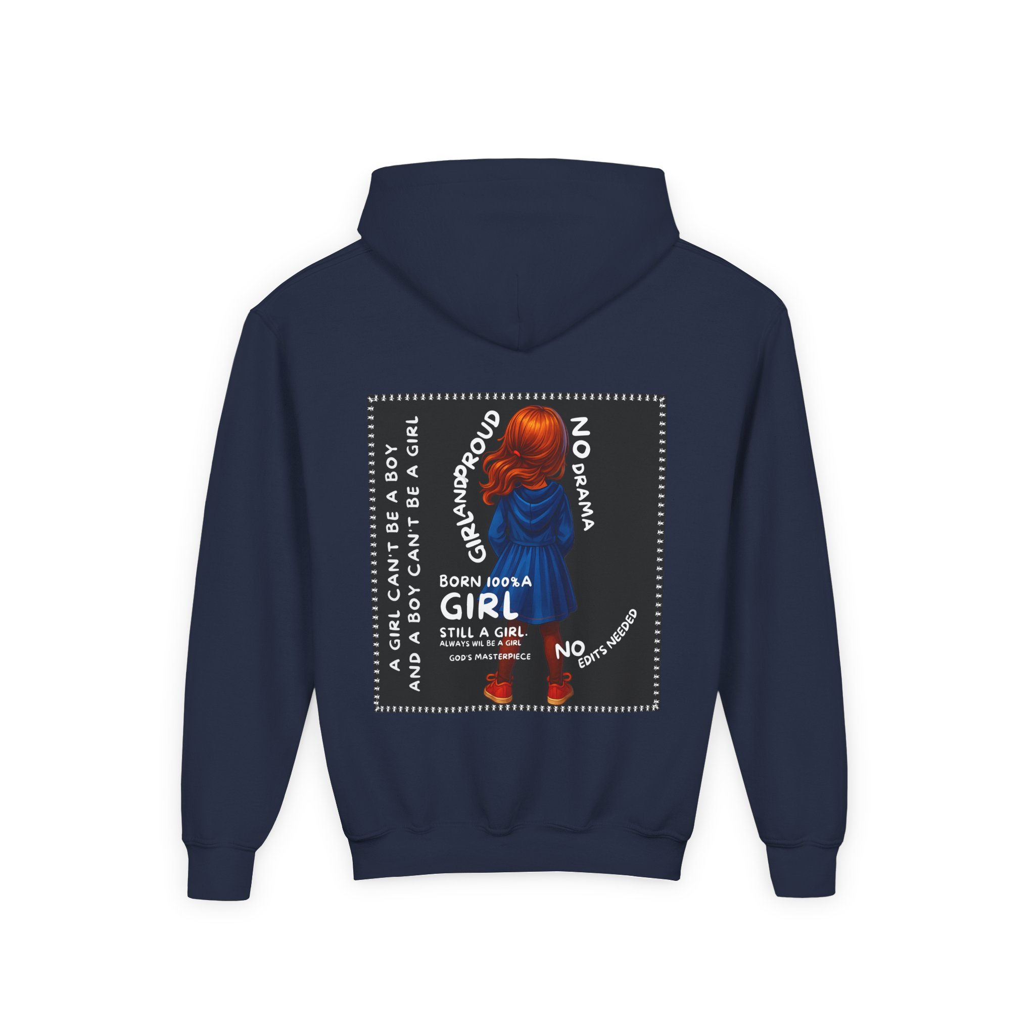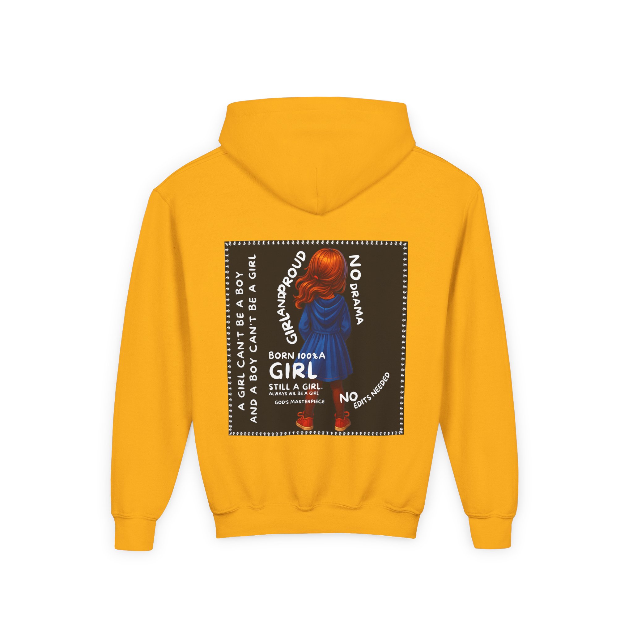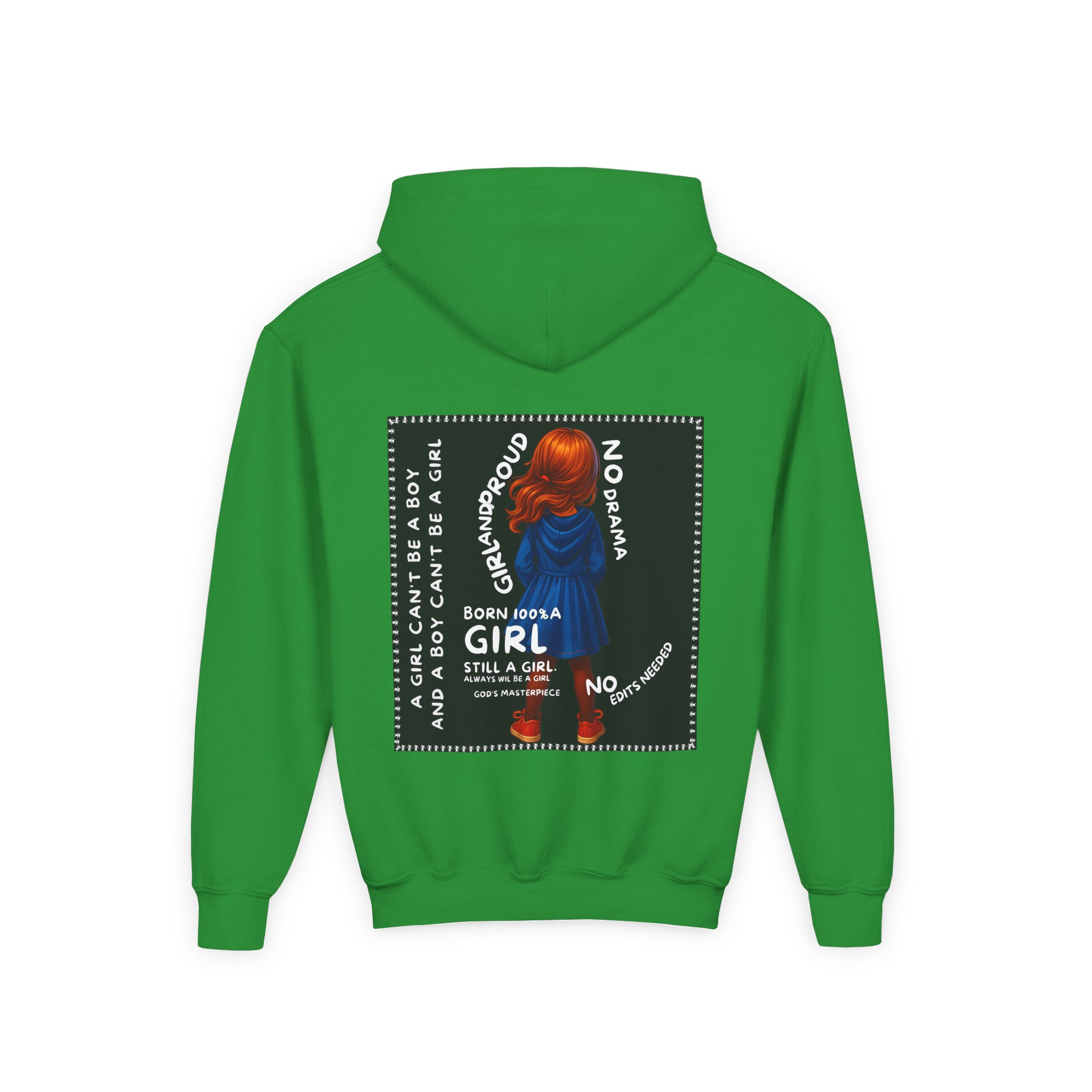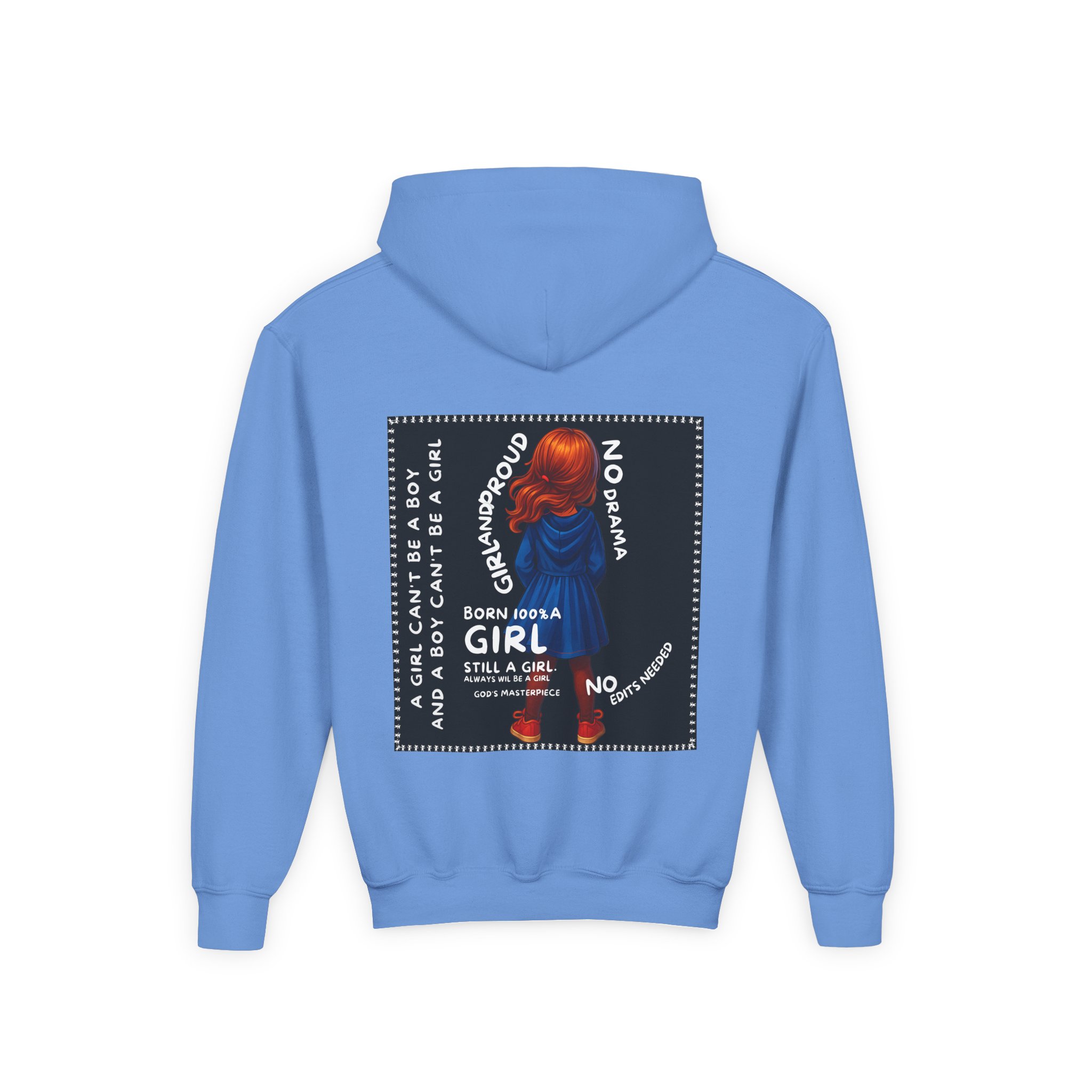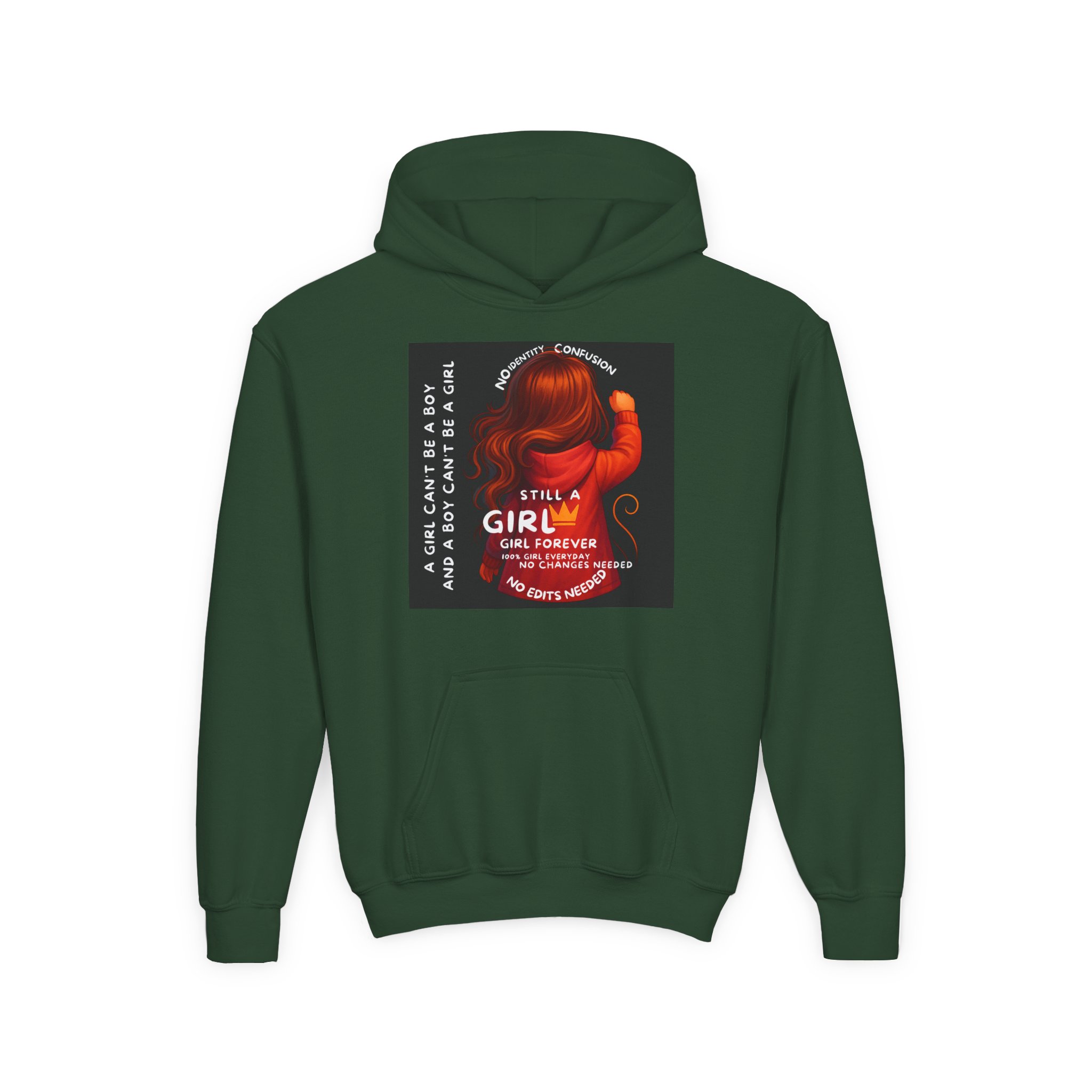 Girl Kids Hoodie – Sweatshirt, Boy is not a Girl and Girl is not a Boy design, Youth Fashion, Birthday Gift, Everyday Wear. Stay cozy and stylish with this comfortable Youth Heavy Blend Hooded Sweatshirt. Perfect for children, this hoodie features adorable designs that promote fun conversations about identity. Ideal for casual outings, school events, or simply lounging at home, it brings a cheerful vibe to any day. The spacious kangaroo pocket adds a touch of practicality, keeping little hands warm while providing a convenient space for storing small treasures. Great for birthdays, back-to-school, or any celebration where kids want to express themselves! Product features – Twill necktape for comfort and stability – Spacious kangaroo pouch pocket – Durable 50% cotton, 50% polyester blend – Embroidery option available for customization – Regular fit that runs true to size Care instructions – Machine wash: warm (max 40C or 105F) – Bleach as needed – Tumble dry: medium heat – Do not dry clean – Do not iron