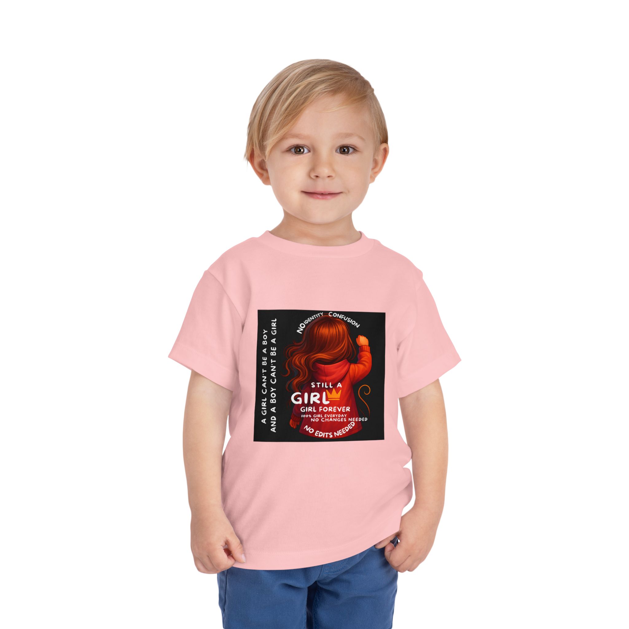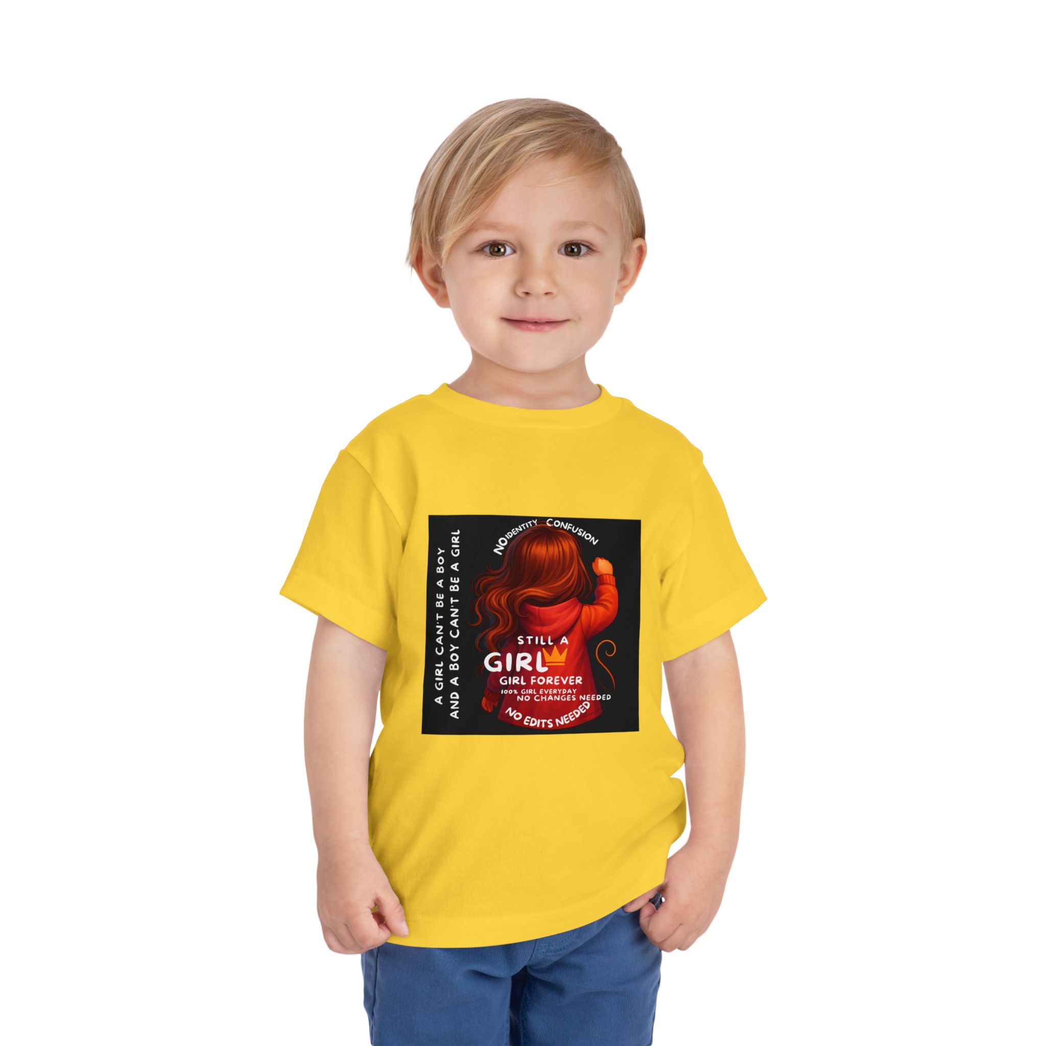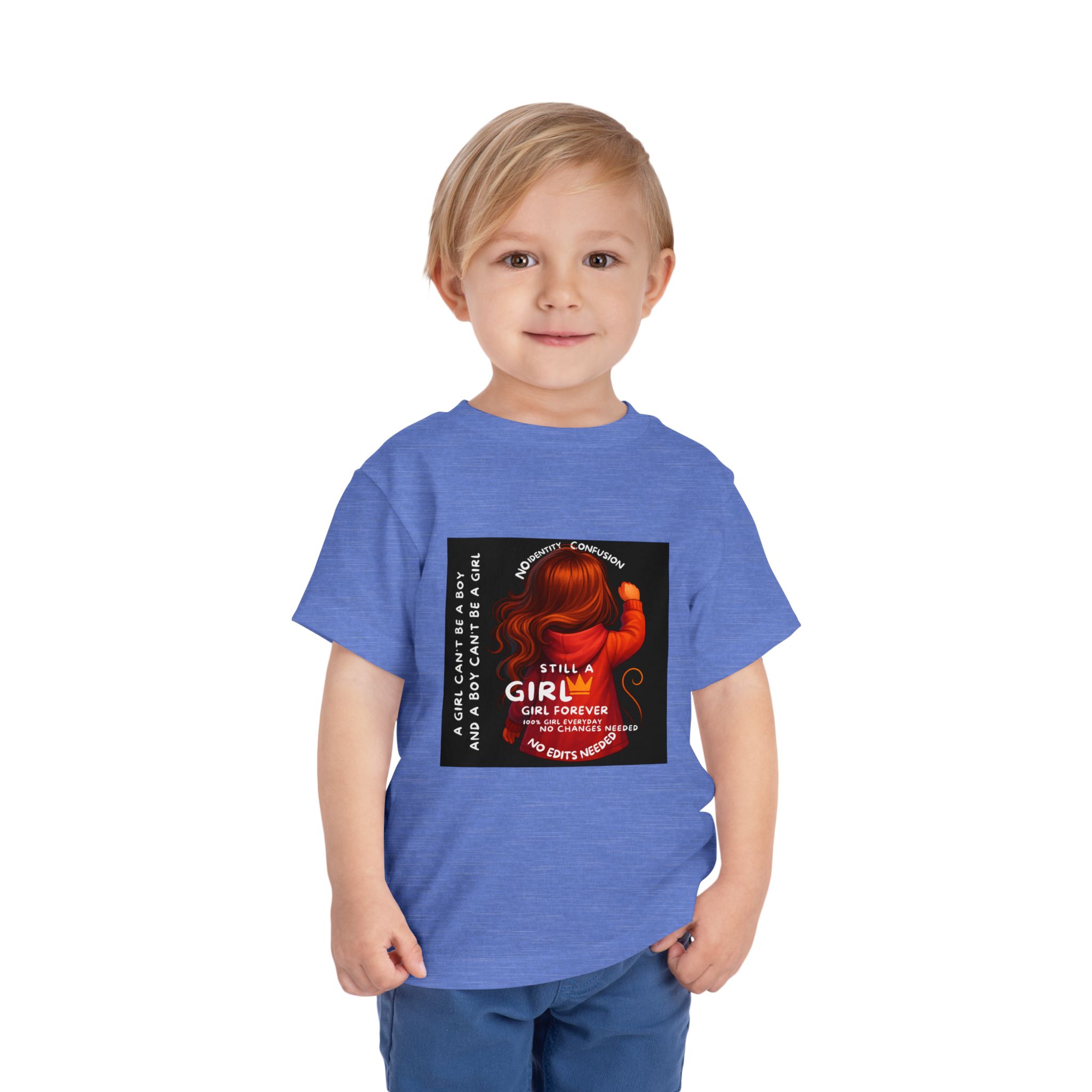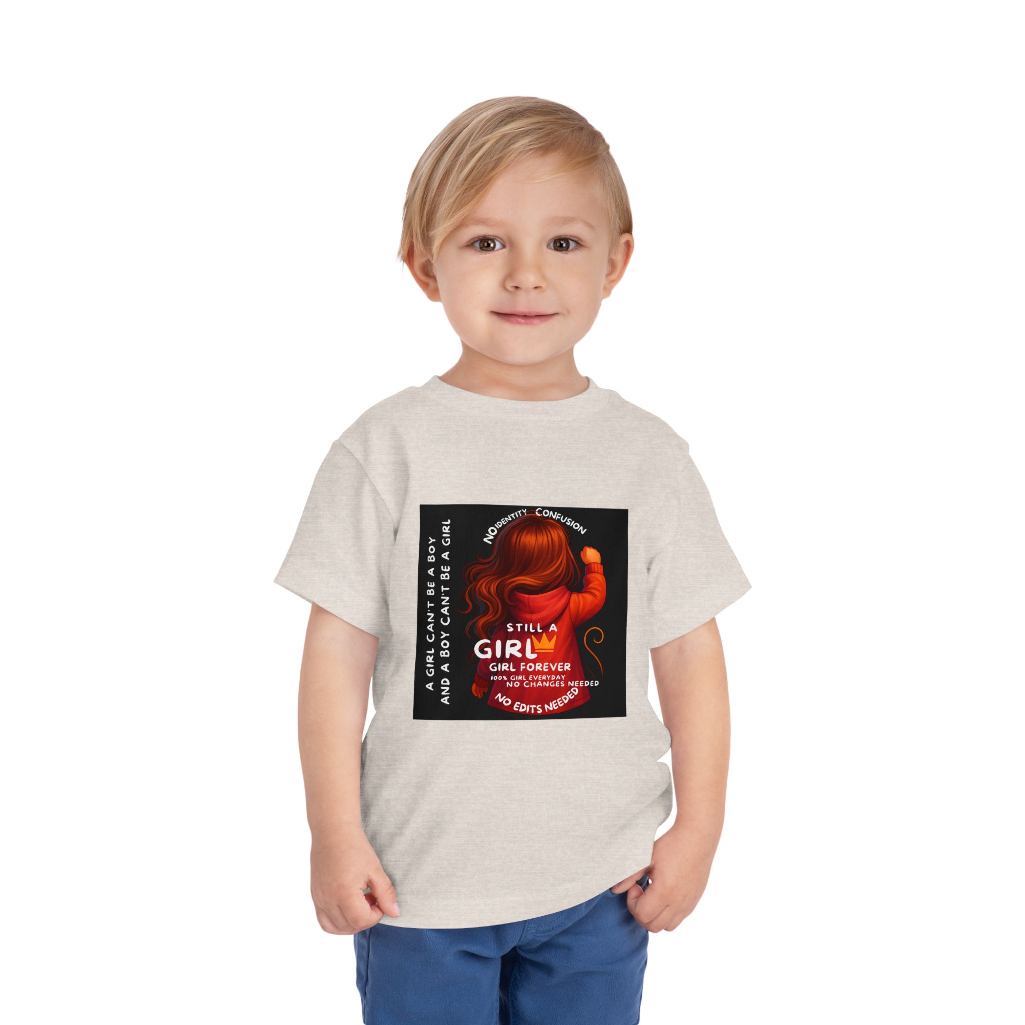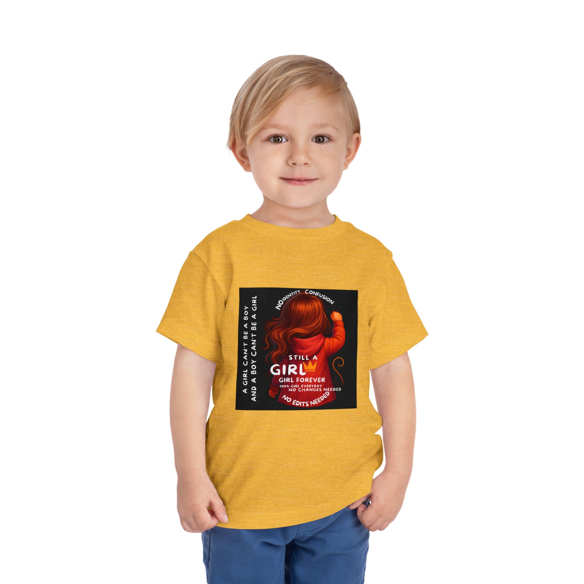 Girl Toddler Tee: Celebrate Identity with Girl is not a Boy and Boy is not a Girl design. Introducing our delightful Toddler Short Sleeve Tee, designed for the playful spirit in every little one. This charming tee combines comfort and fun with its light, airy fabric, perfect for keeping your child cool during playdates and outdoor adventures. The colorful design brings joy and creativity, making it an ideal choice for every day or special occasions like birthdays and family gatherings. It resonates with parents who value individuality, fostering self-expression in young ones. Crafted from soft cotton, this tee is gentle on sensitive skin and perfect for boys and girls alike. Celebrate childhood with this vibrant addition to their wardrobe! Product features – Side seams provide structural integrity and shape. – Soft fiber composition for maximum comfort. – Lightweight fabric designed for active play. – Tear-away label for a fuss-free experience. – Perfect for everyday wear and special occasions. Care instructions – Machine wash: cold (max 30C or 90F) – Do not bleach – Tumble dry: low heat – Iron, steam or dry: low heat – Do not dry clean