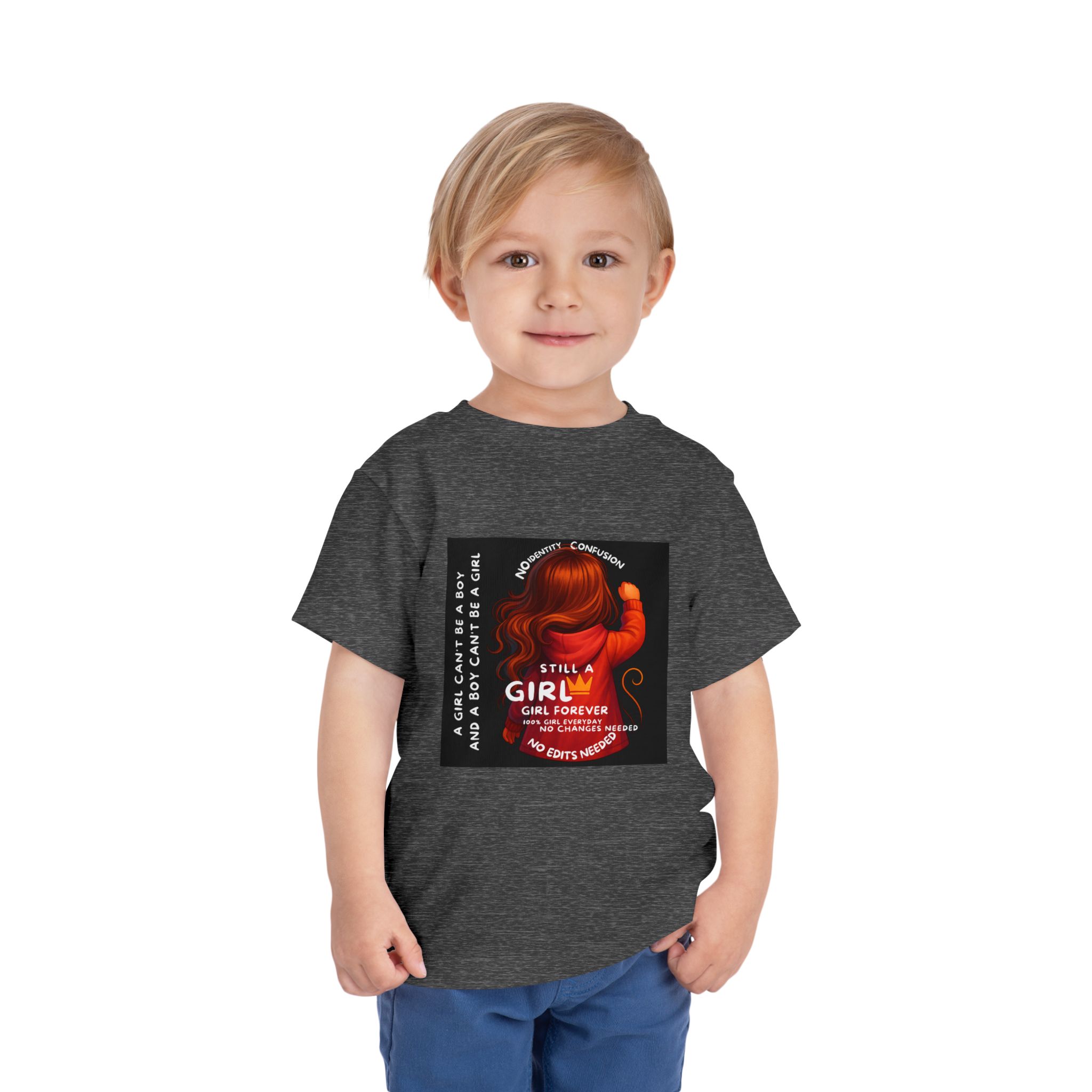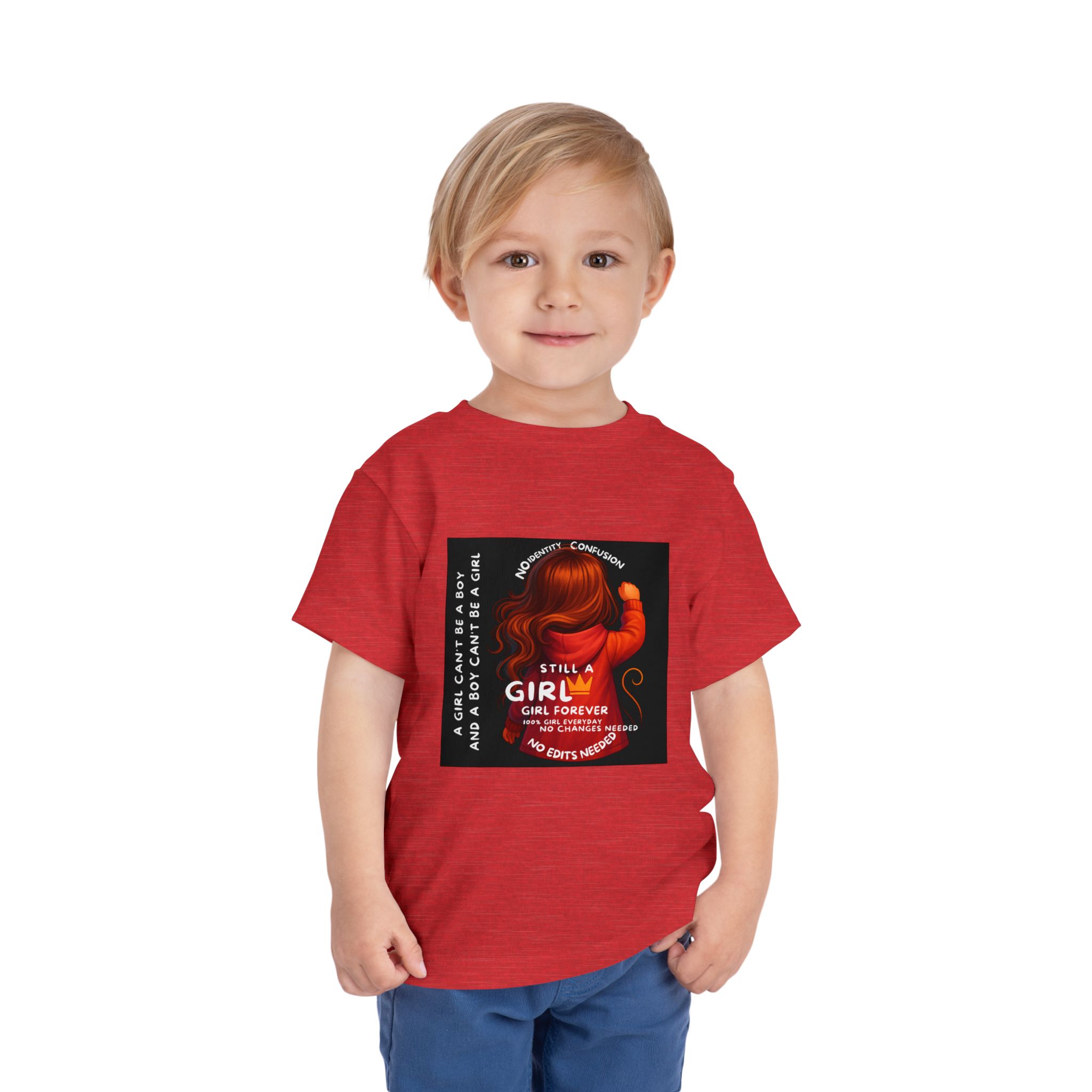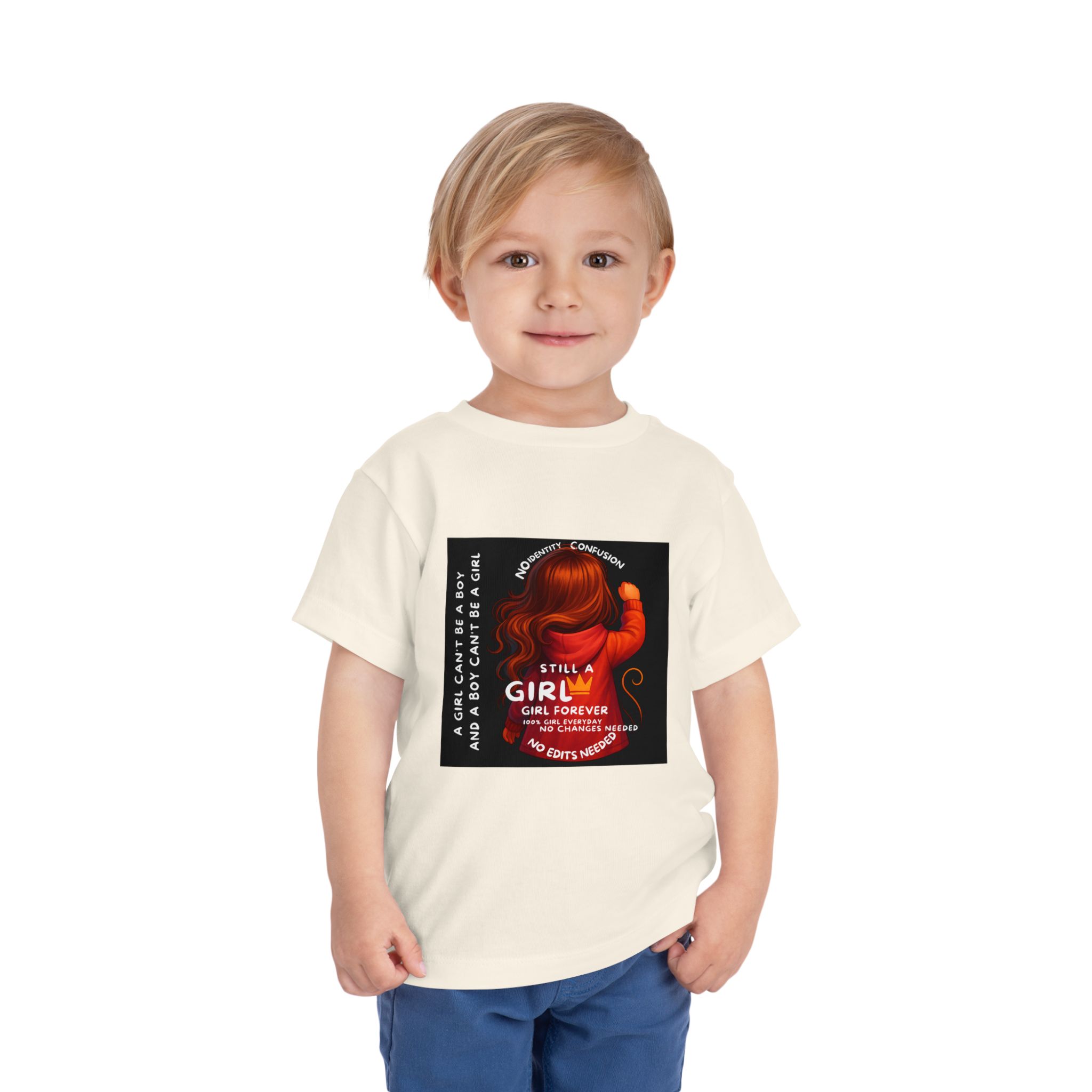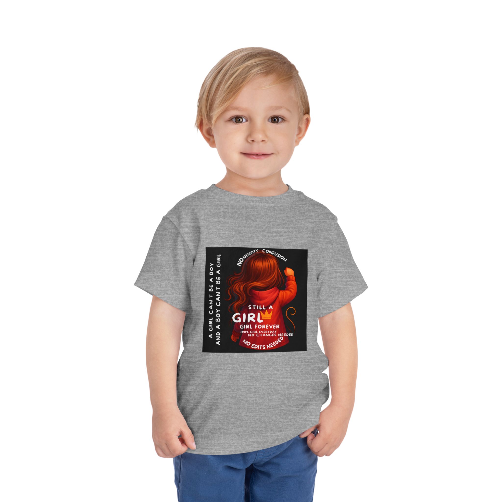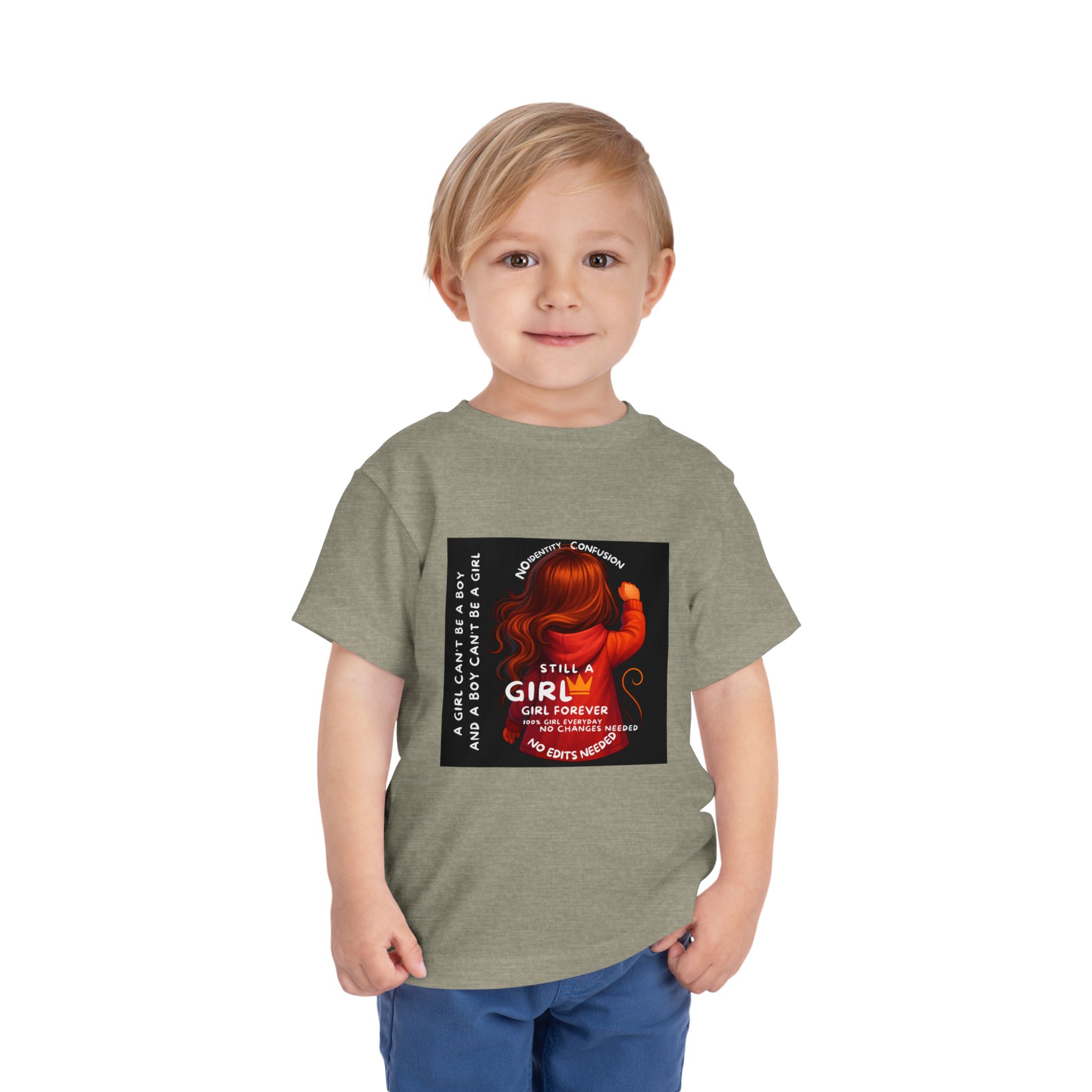 Girl Toddler Tee: Celebrate Identity with Girl is not a Boy and Boy is not a Girl design. Introducing our delightful Toddler Short Sleeve Tee, designed for the playful spirit in every little one. This charming tee combines comfort and fun with its light, airy fabric, perfect for keeping your child cool during playdates and outdoor adventures. The colorful design brings joy and creativity, making it an ideal choice for every day or special occasions like birthdays and family gatherings. It resonates with parents who value individuality, fostering self-expression in young ones. Crafted from soft cotton, this tee is gentle on sensitive skin and perfect for boys and girls alike. Celebrate childhood with this vibrant addition to their wardrobe! Product features – Side seams provide structural integrity and shape. – Soft fiber composition for maximum comfort. – Lightweight fabric designed for active play. – Tear-away label for a fuss-free experience. – Perfect for everyday wear and special occasions. Care instructions – Machine wash: cold (max 30C or 90F) – Do not bleach – Tumble dry: low heat – Iron, steam or dry: low heat – Do not dry clean