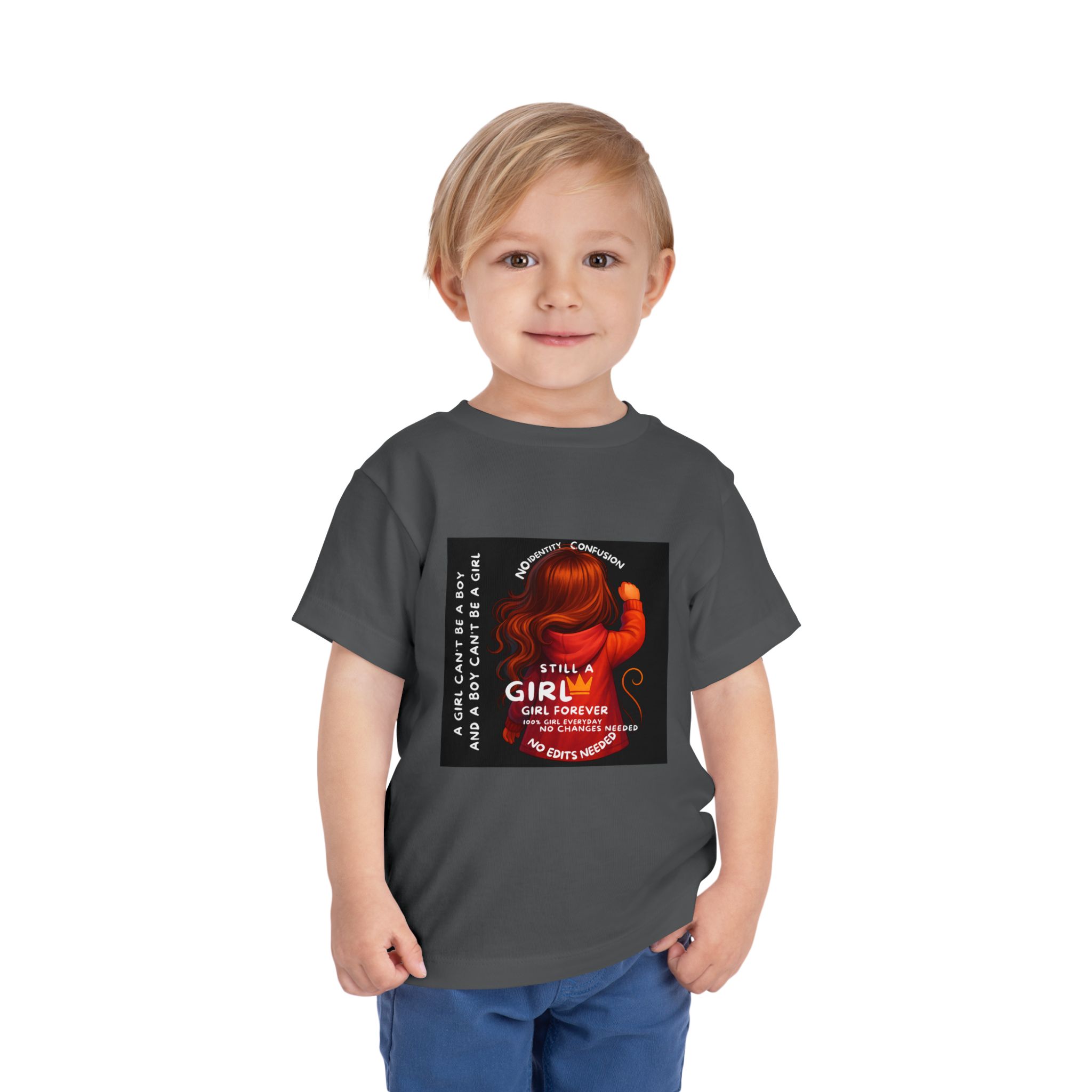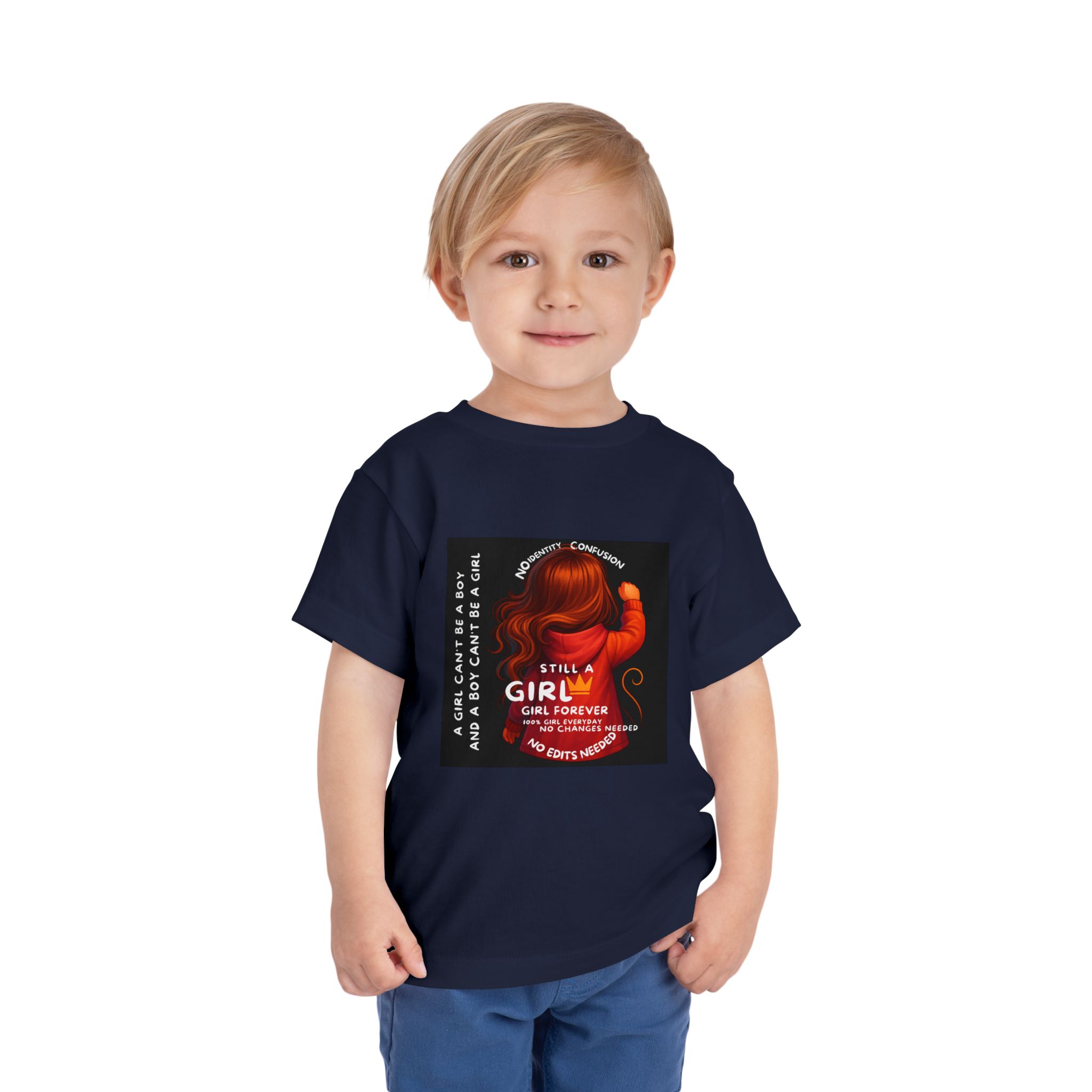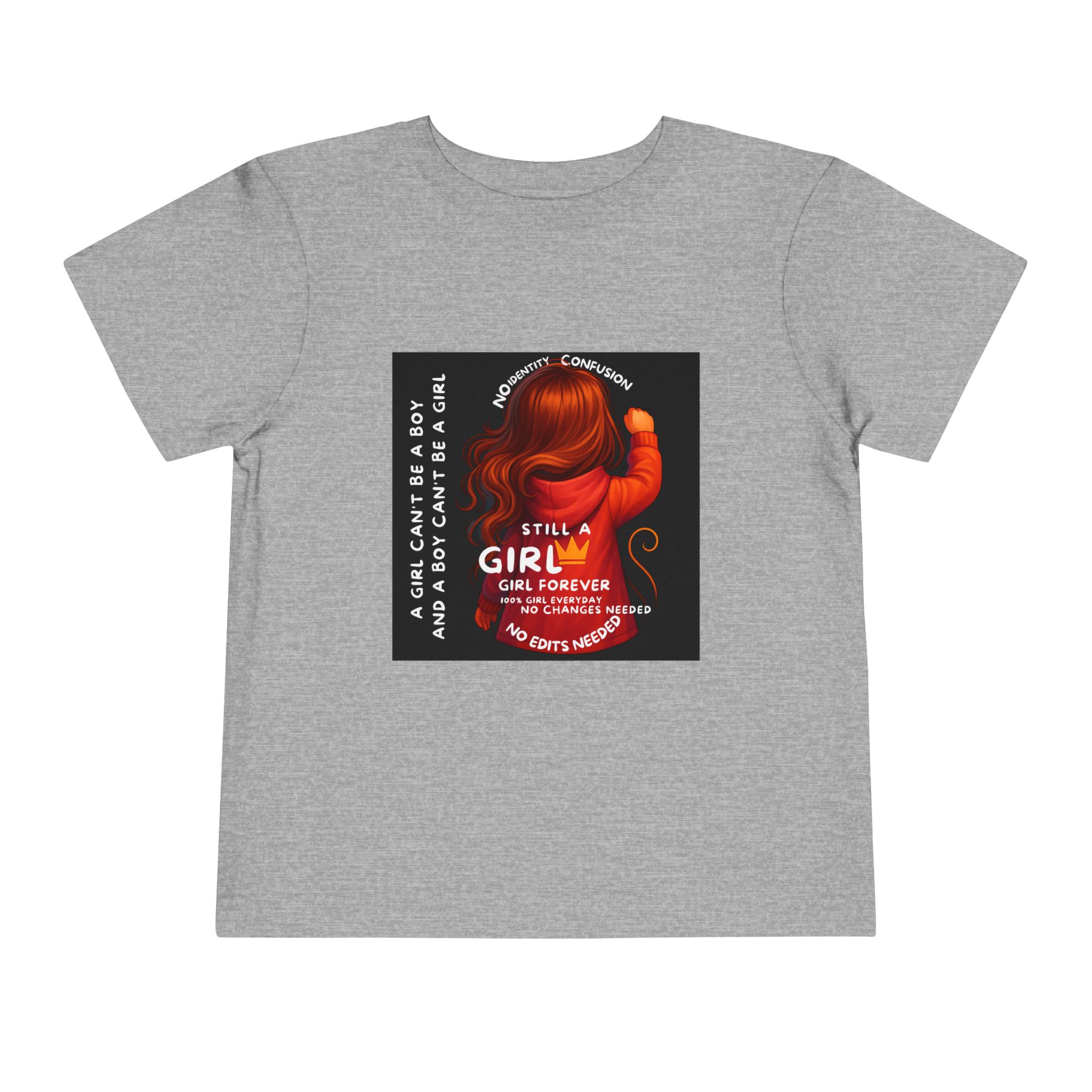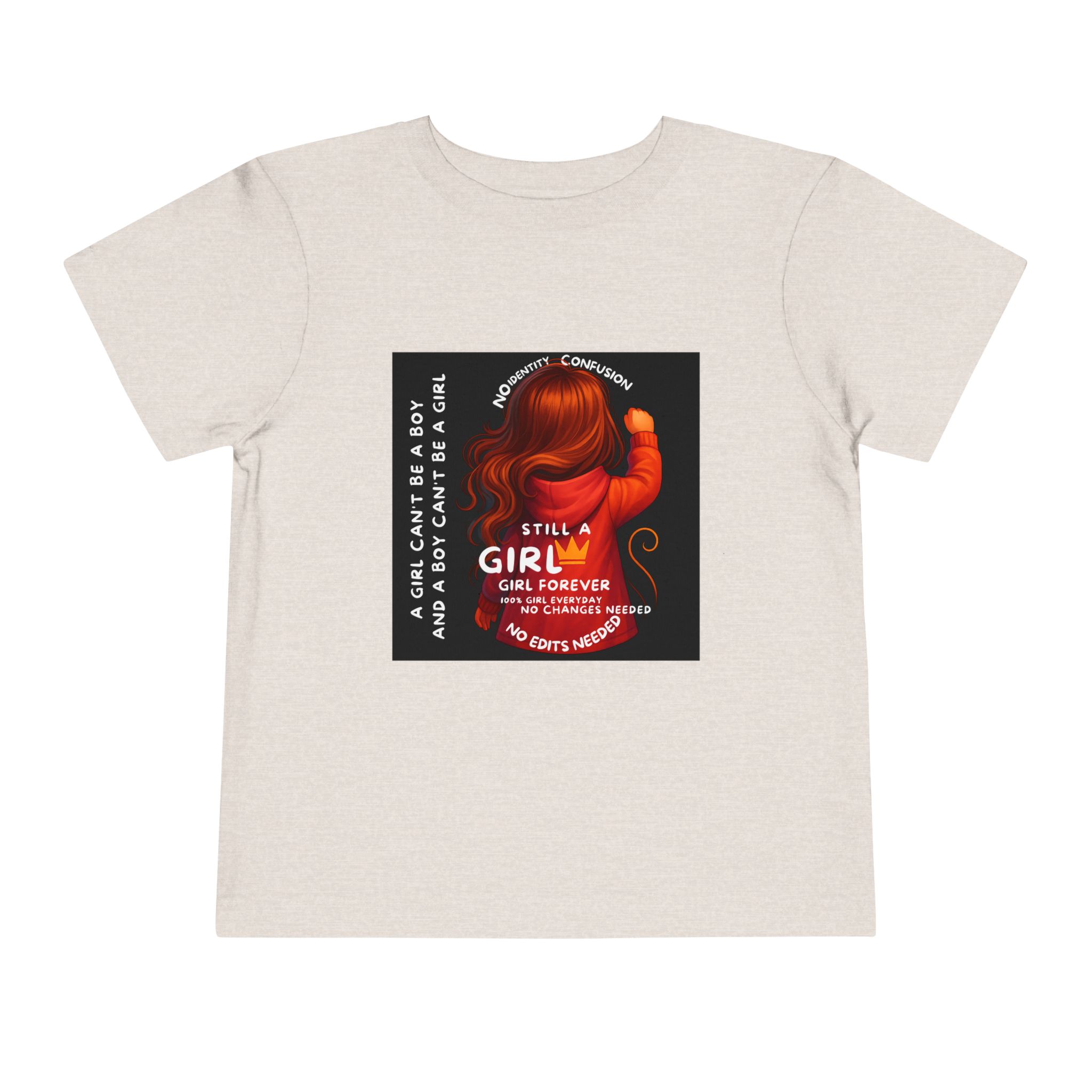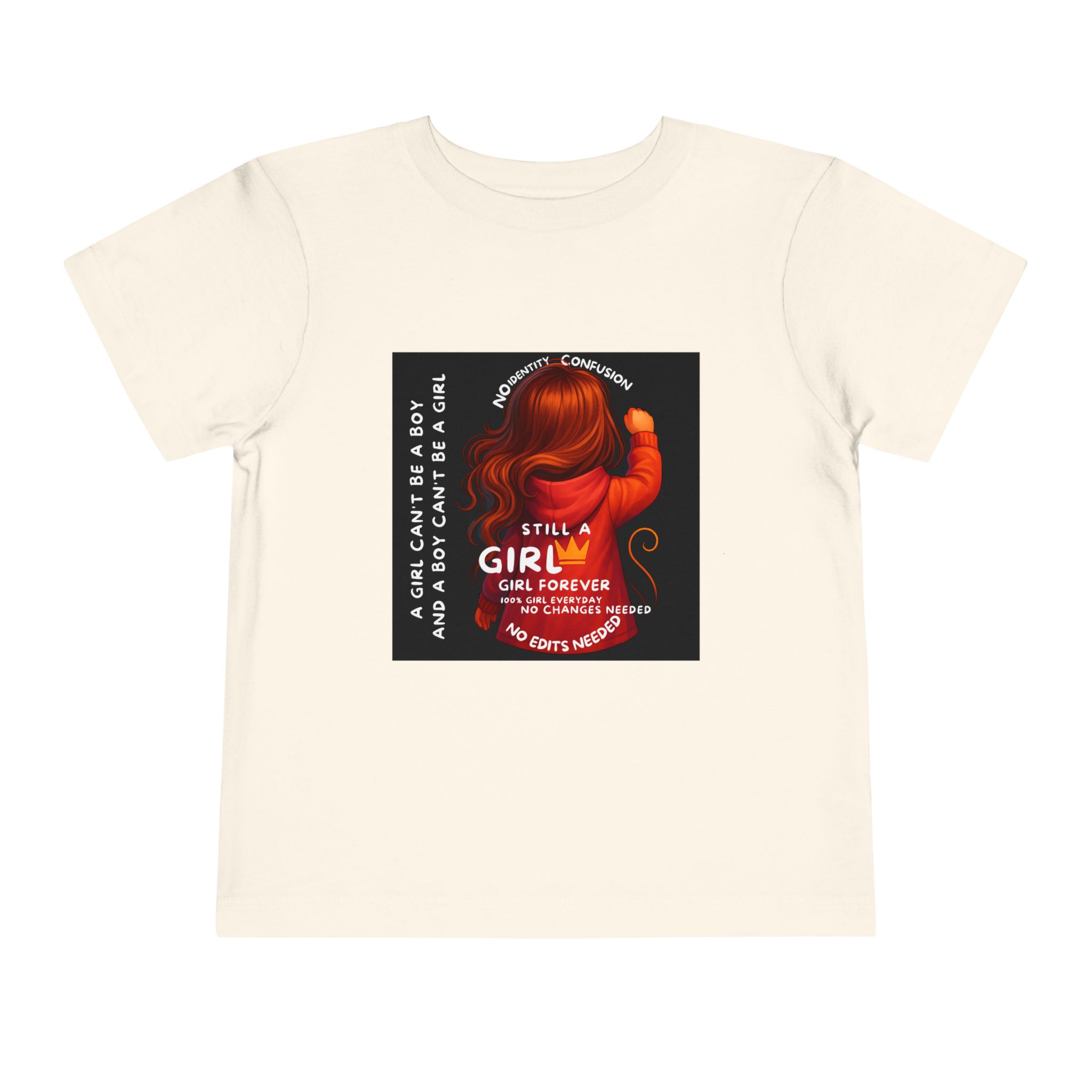 Girl Toddler Tee: Celebrate Identity with Girl is not a Boy and Boy is not a Girl design. Introducing our delightful Toddler Short Sleeve Tee, designed for the playful spirit in every little one. This charming tee combines comfort and fun with its light, airy fabric, perfect for keeping your child cool during playdates and outdoor adventures. The colorful design brings joy and creativity, making it an ideal choice for every day or special occasions like birthdays and family gatherings. It resonates with parents who value individuality, fostering self-expression in young ones. Crafted from soft cotton, this tee is gentle on sensitive skin and perfect for boys and girls alike. Celebrate childhood with this vibrant addition to their wardrobe! Product features – Side seams provide structural integrity and shape. – Soft fiber composition for maximum comfort. – Lightweight fabric designed for active play. – Tear-away label for a fuss-free experience. – Perfect for everyday wear and special occasions. Care instructions – Machine wash: cold (max 30C or 90F) – Do not bleach – Tumble dry: low heat – Iron, steam or dry: low heat – Do not dry clean