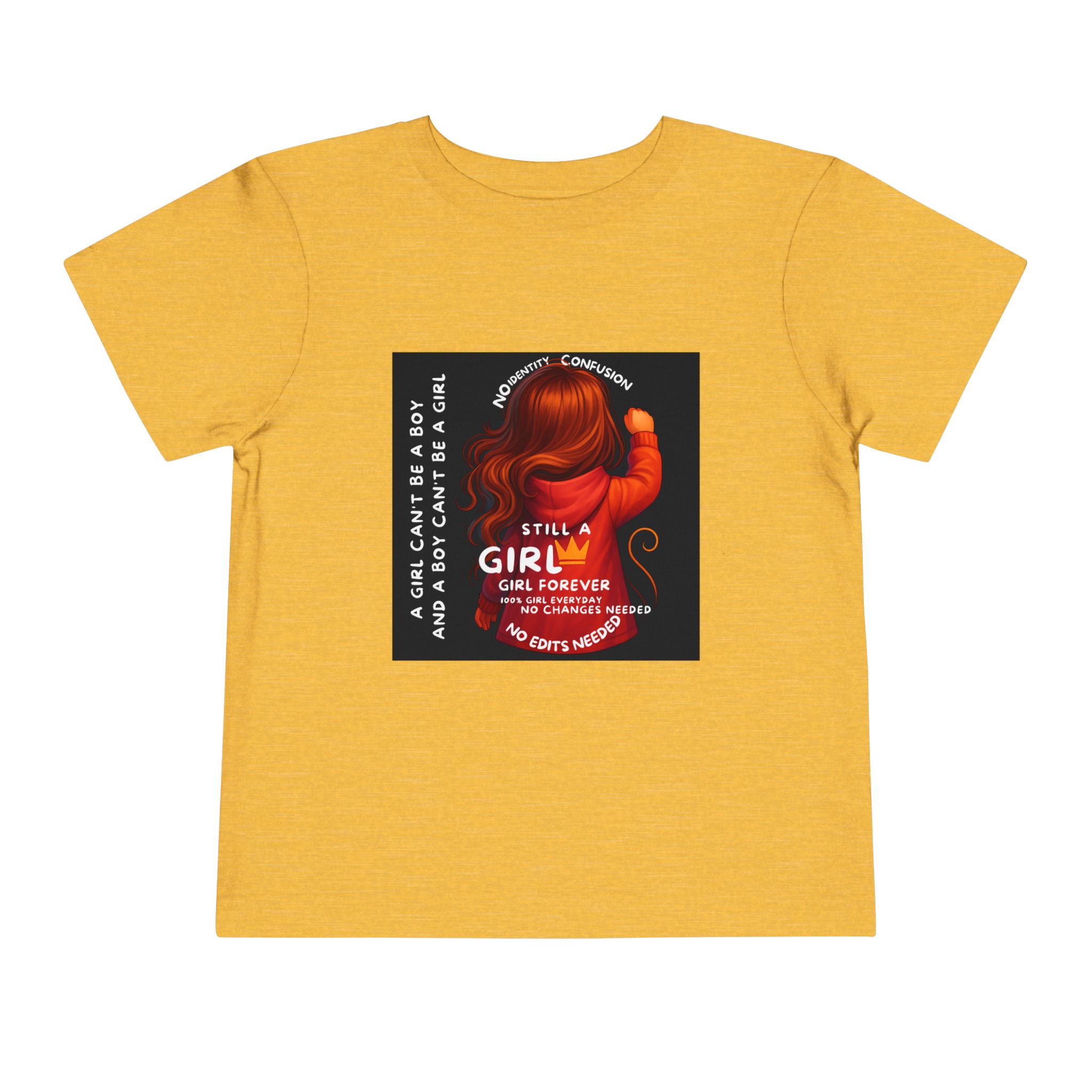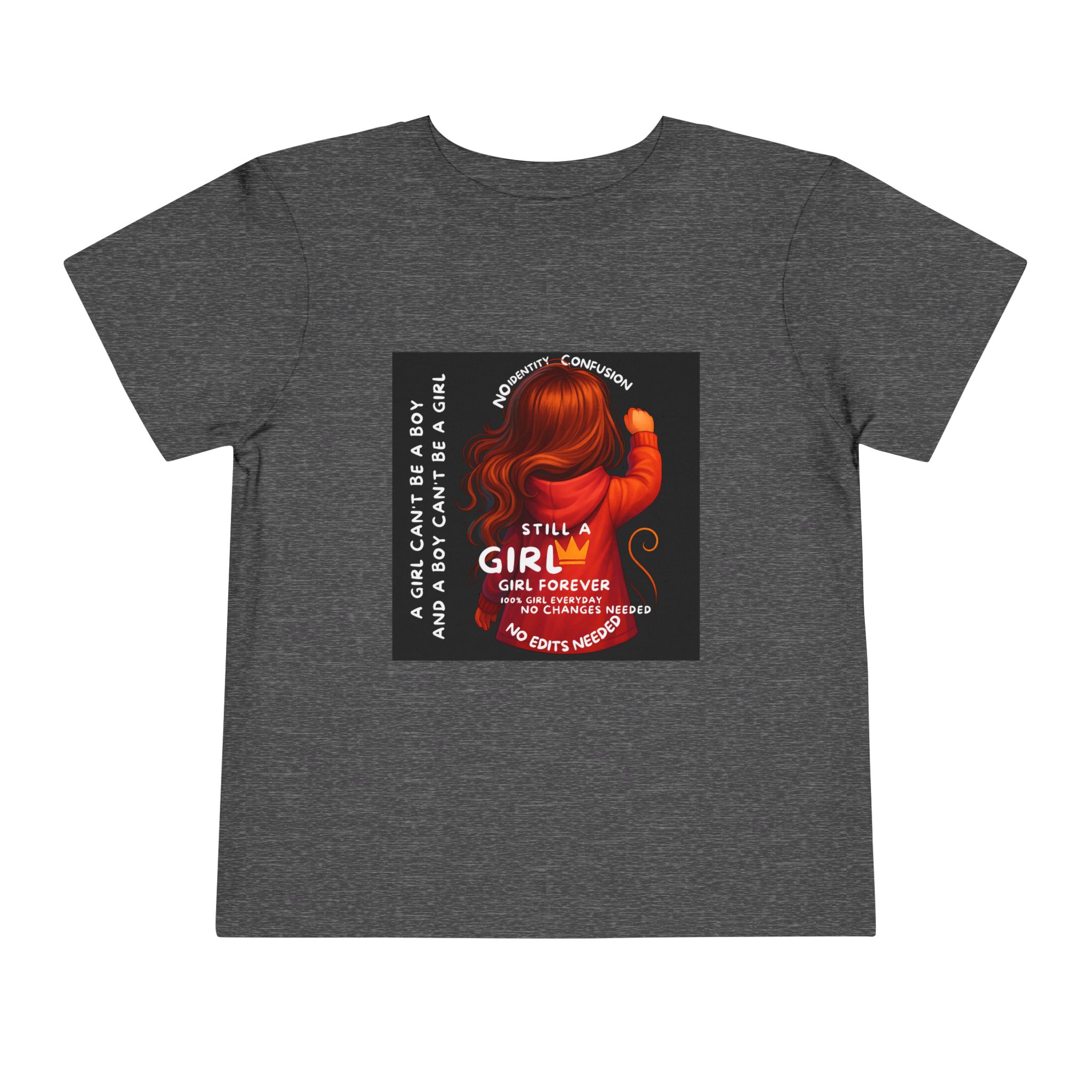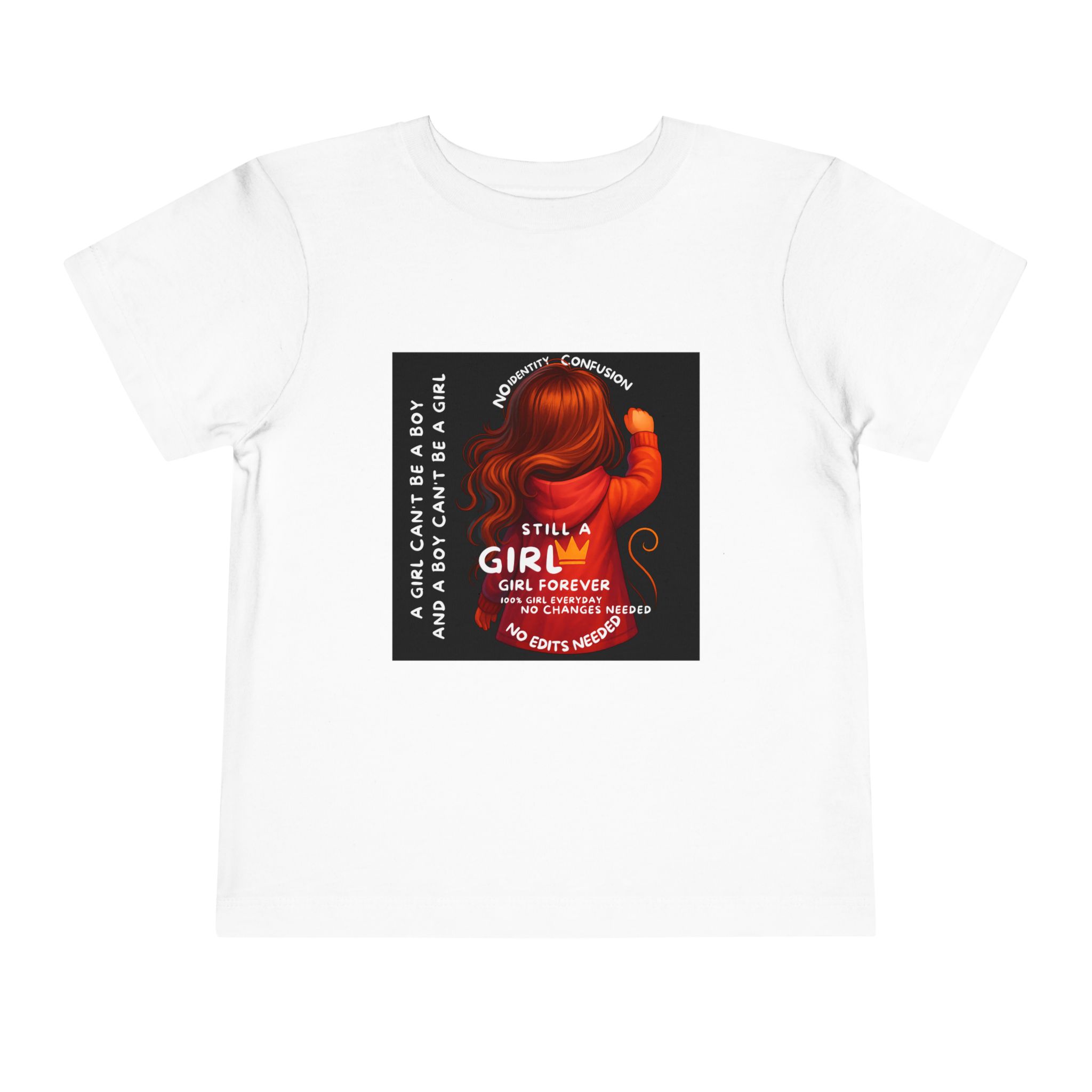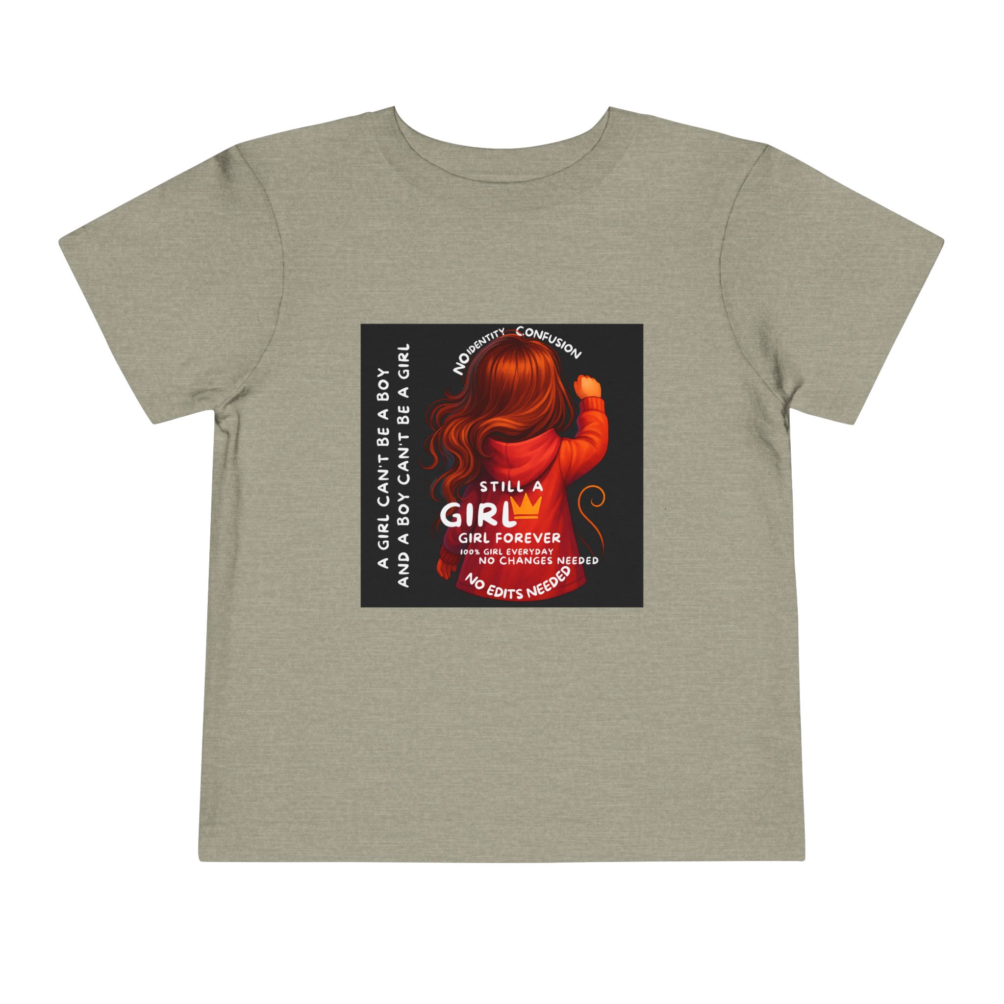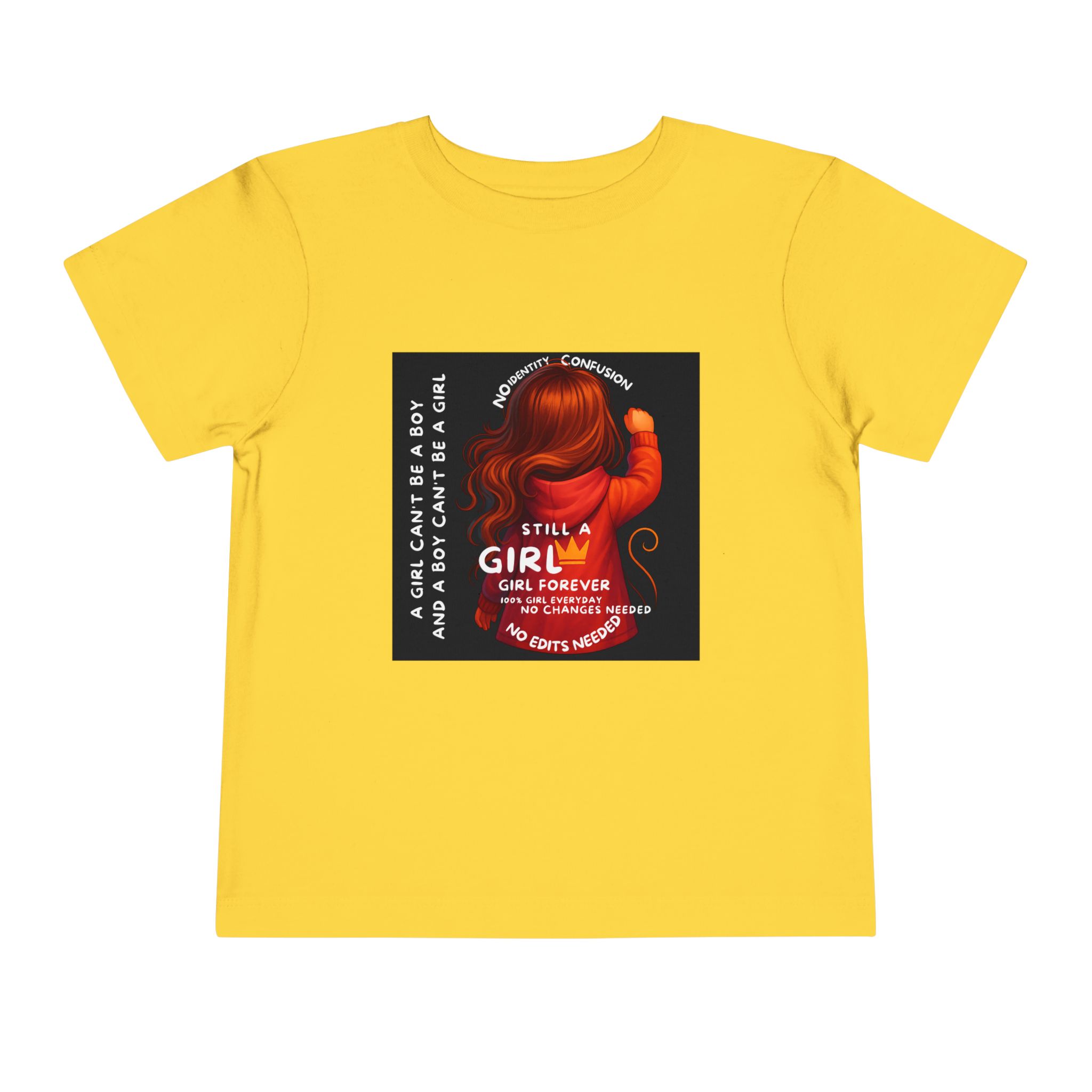 Girl Toddler Tee: Celebrate Identity with Girl is not a Boy and Boy is not a Girl design. Introducing our delightful Toddler Short Sleeve Tee, designed for the playful spirit in every little one. This charming tee combines comfort and fun with its light, airy fabric, perfect for keeping your child cool during playdates and outdoor adventures. The colorful design brings joy and creativity, making it an ideal choice for every day or special occasions like birthdays and family gatherings. It resonates with parents who value individuality, fostering self-expression in young ones. Crafted from soft cotton, this tee is gentle on sensitive skin and perfect for boys and girls alike. Celebrate childhood with this vibrant addition to their wardrobe! Product features – Side seams provide structural integrity and shape. – Soft fiber composition for maximum comfort. – Lightweight fabric designed for active play. – Tear-away label for a fuss-free experience. – Perfect for everyday wear and special occasions. Care instructions – Machine wash: cold (max 30C or 90F) – Do not bleach – Tumble dry: low heat – Iron, steam or dry: low heat – Do not dry clean
