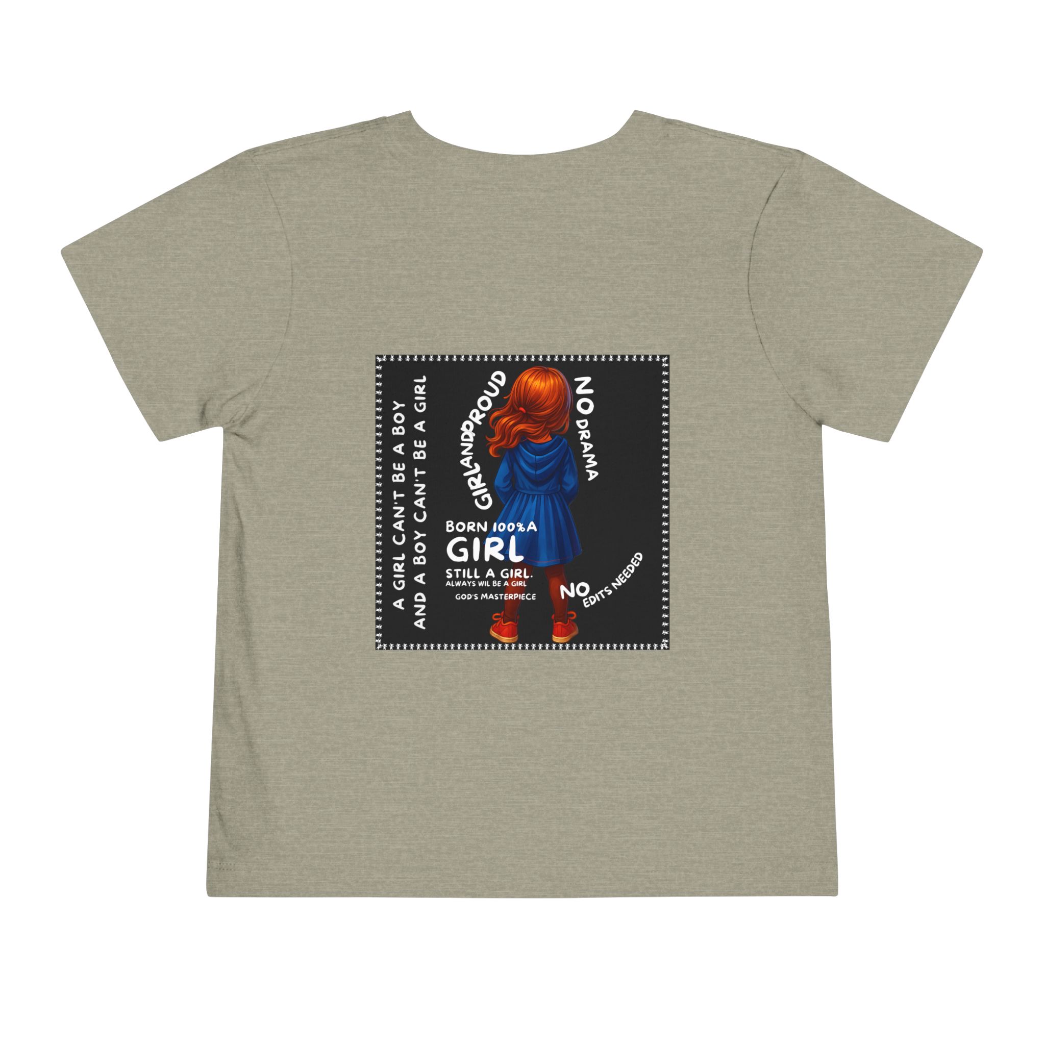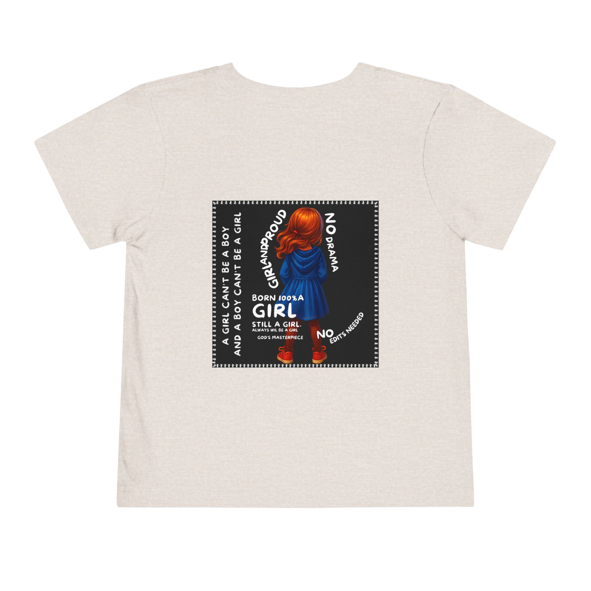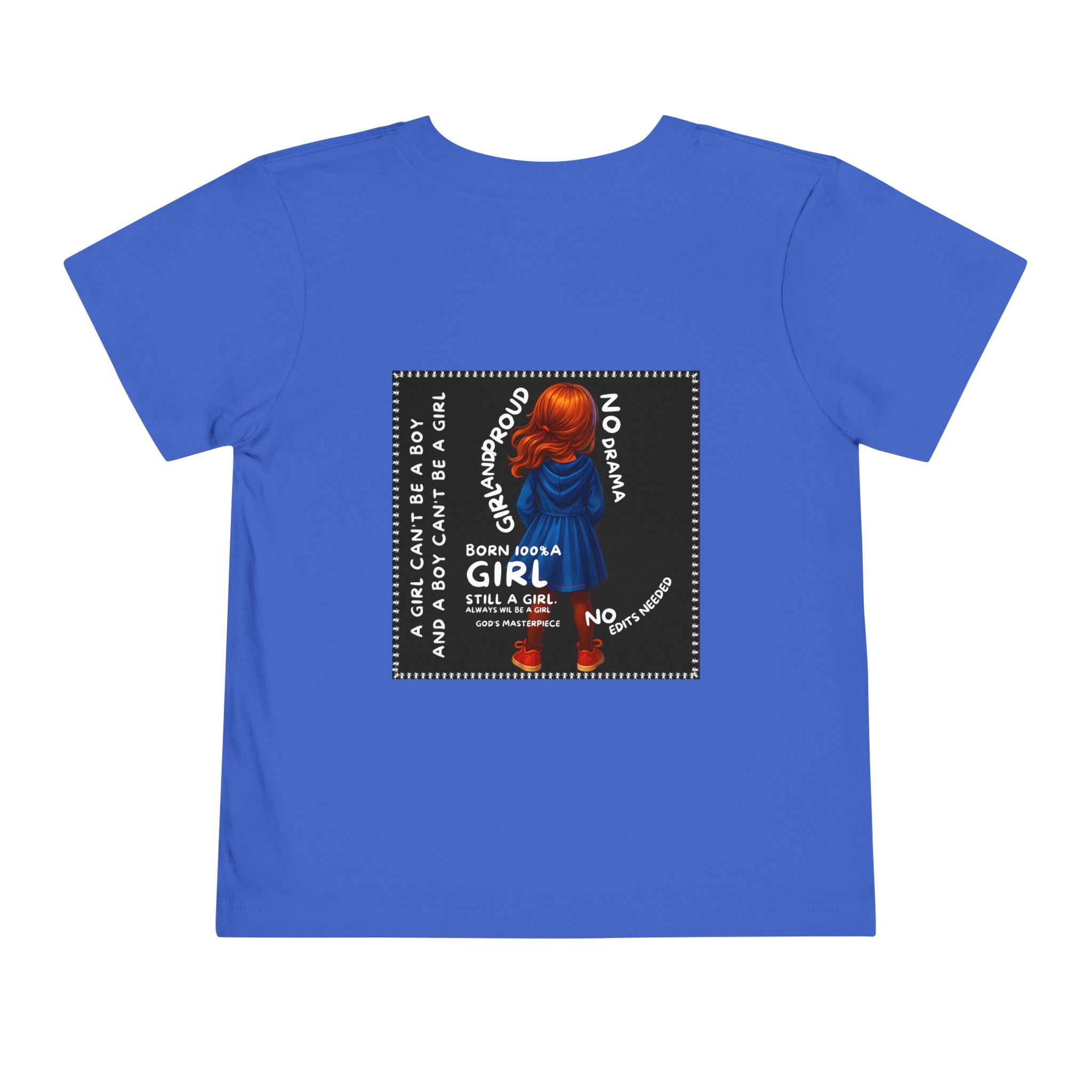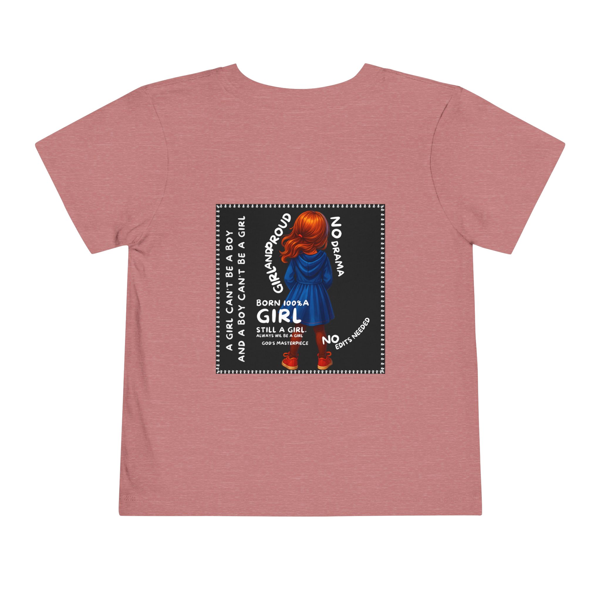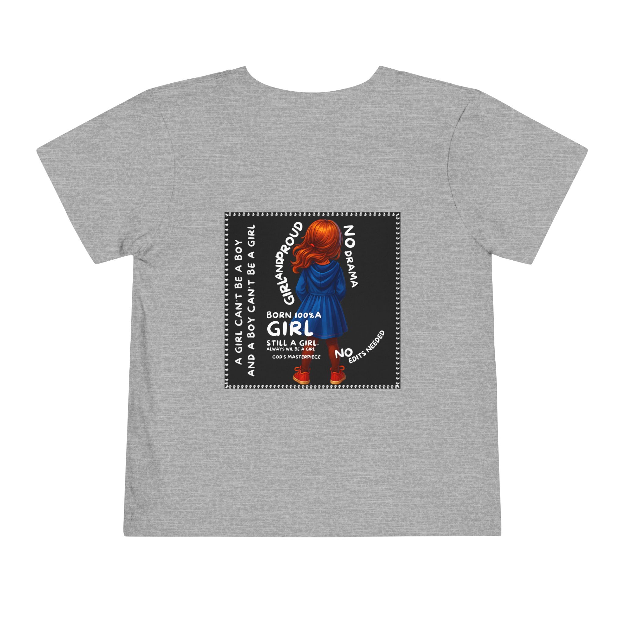 Girl Toddler Tee: Celebrate Identity with Girl is not a Boy and Boy is not a Girl design. Introducing our delightful Toddler Short Sleeve Tee, designed for the playful spirit in every little one. This charming tee combines comfort and fun with its light, airy fabric, perfect for keeping your child cool during playdates and outdoor adventures. The colorful design brings joy and creativity, making it an ideal choice for every day or special occasions like birthdays and family gatherings. It resonates with parents who value individuality, fostering self-expression in young ones. Crafted from soft cotton, this tee is gentle on sensitive skin and perfect for boys and girls alike. Celebrate childhood with this vibrant addition to their wardrobe! Product features – Side seams provide structural integrity and shape. – Soft fiber composition for maximum comfort. – Lightweight fabric designed for active play. – Tear-away label for a fuss-free experience. – Perfect for everyday wear and special occasions. Care instructions – Machine wash: cold (max 30C or 90F) – Do not bleach – Tumble dry: low heat – Iron, steam or dry: low heat – Do not dry clean
