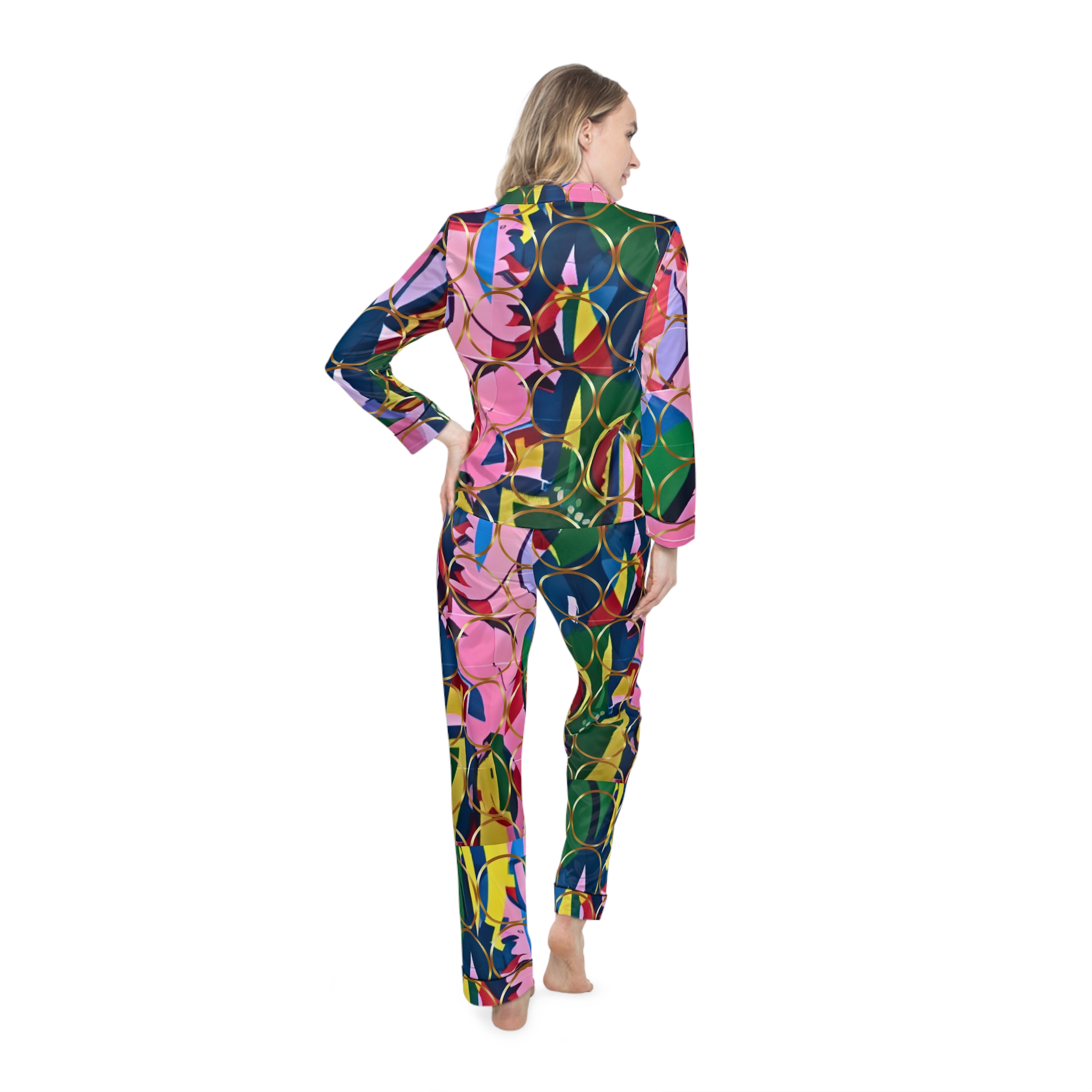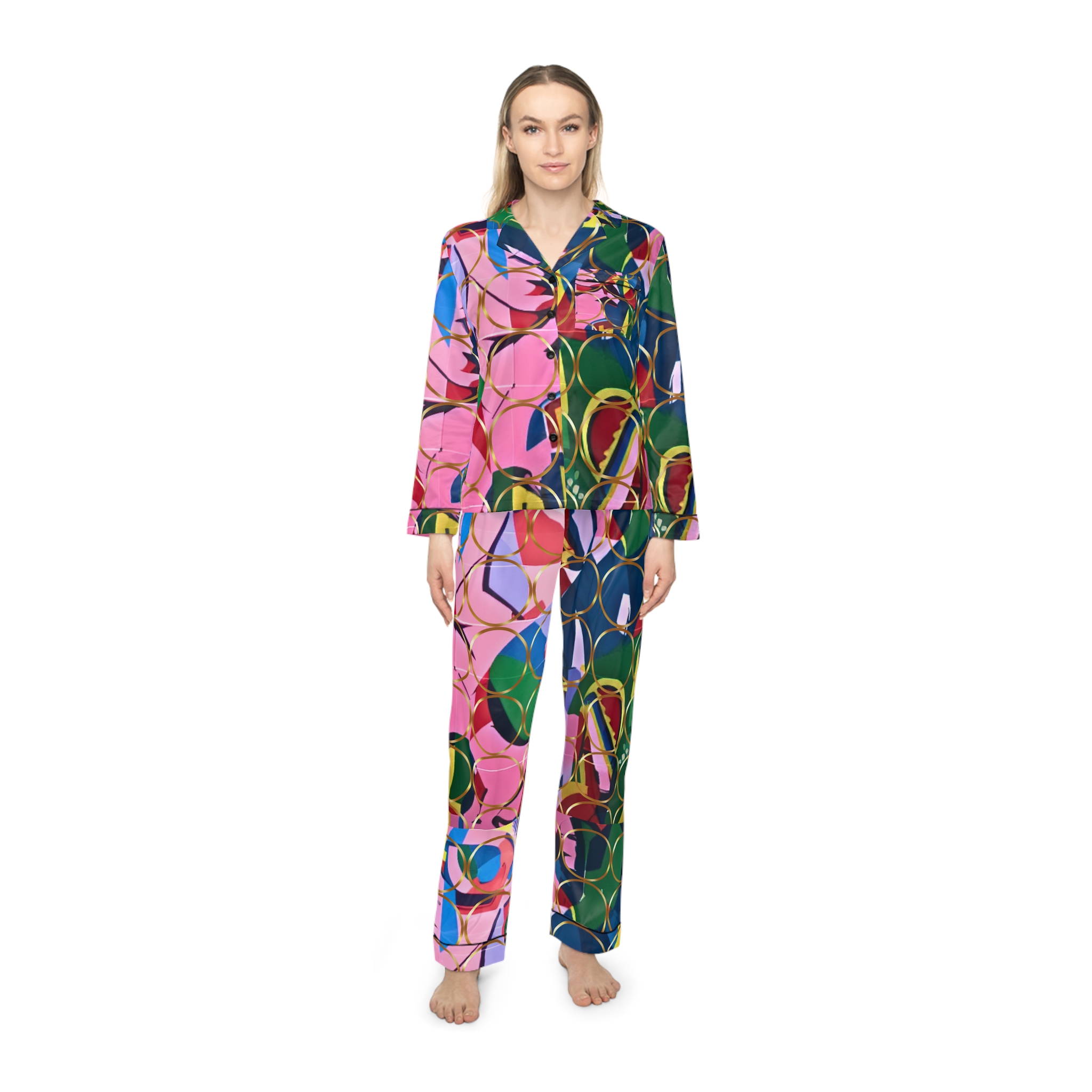 Experience unmatched comfort and elevated design with Hampton Laze designer pyjamas (also known as pajamas). Crafted from a premium satin blend of 95% polyester and 5% spandex, these limited-edition sets feel luxuriously smooth against the skin. Each set features a refined notch lapel collar, black trim details, and a drawstring waist for a tailored yet relaxed fit. Every design is exclusive to Hampton Laze — bold, timeless, and never mass-produced. Perfect for women who value originality, softness, and style, whether lounging or traveling.