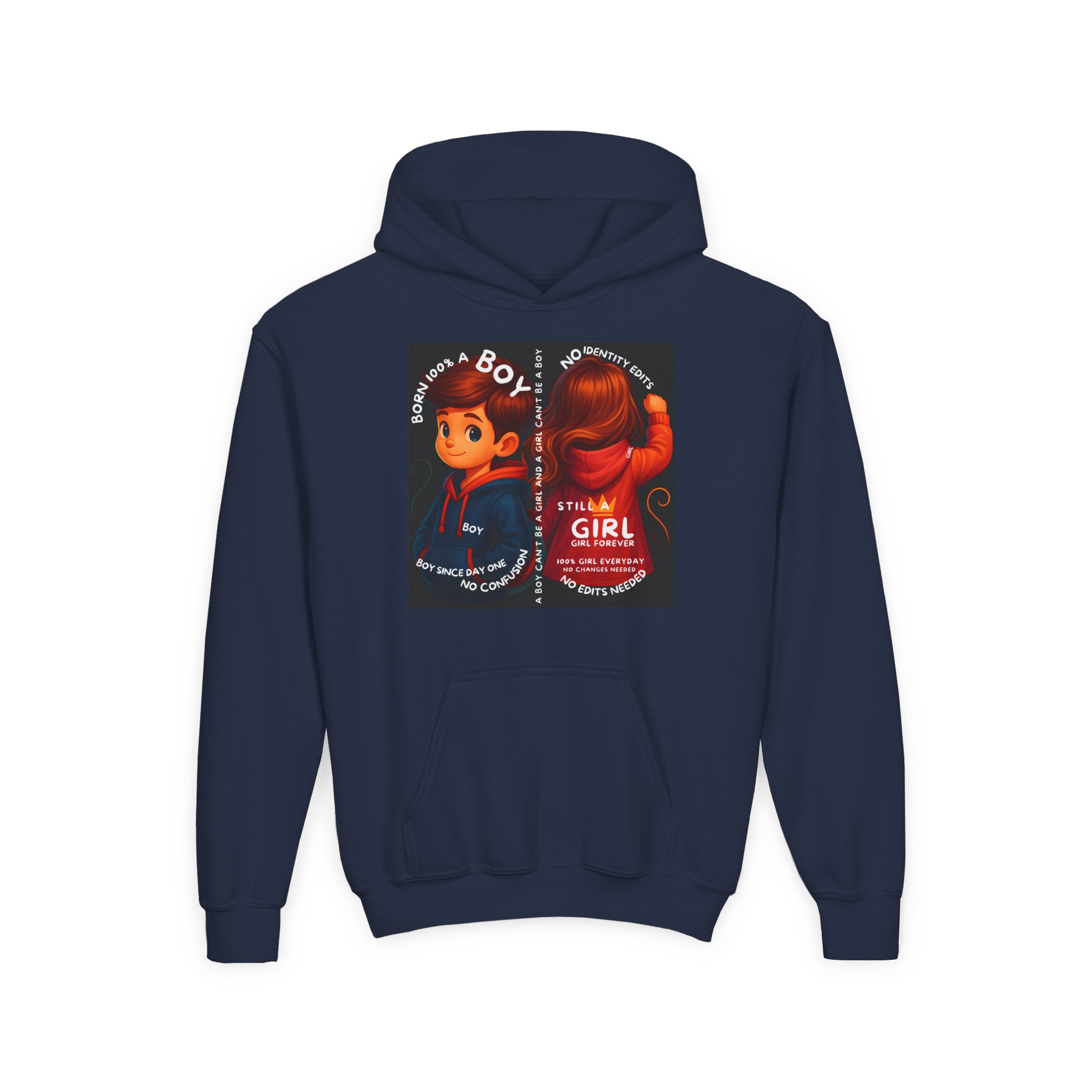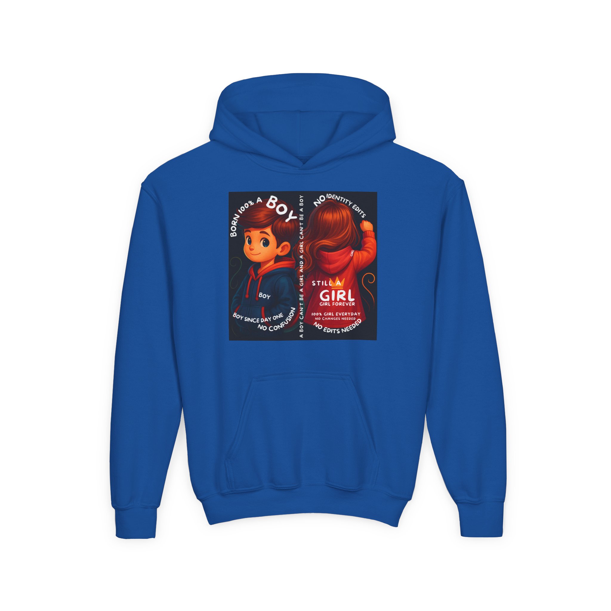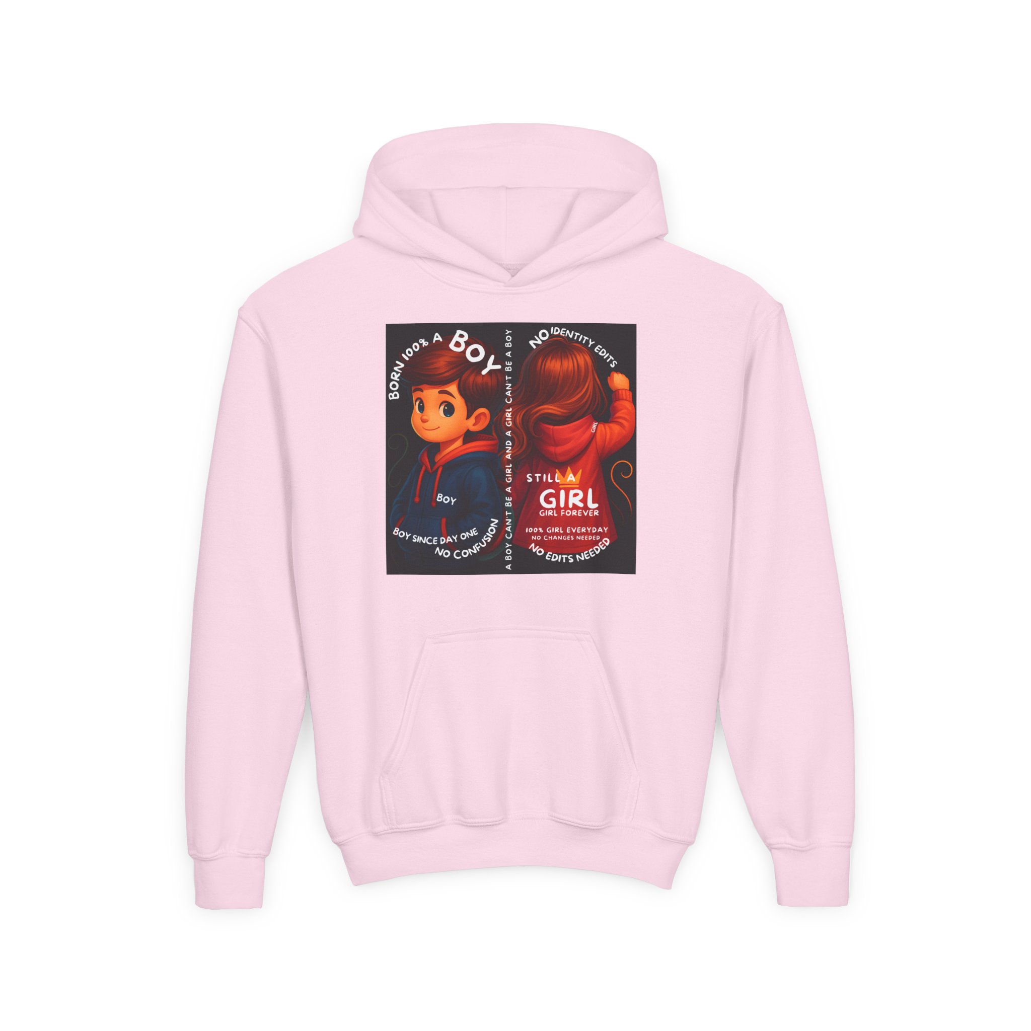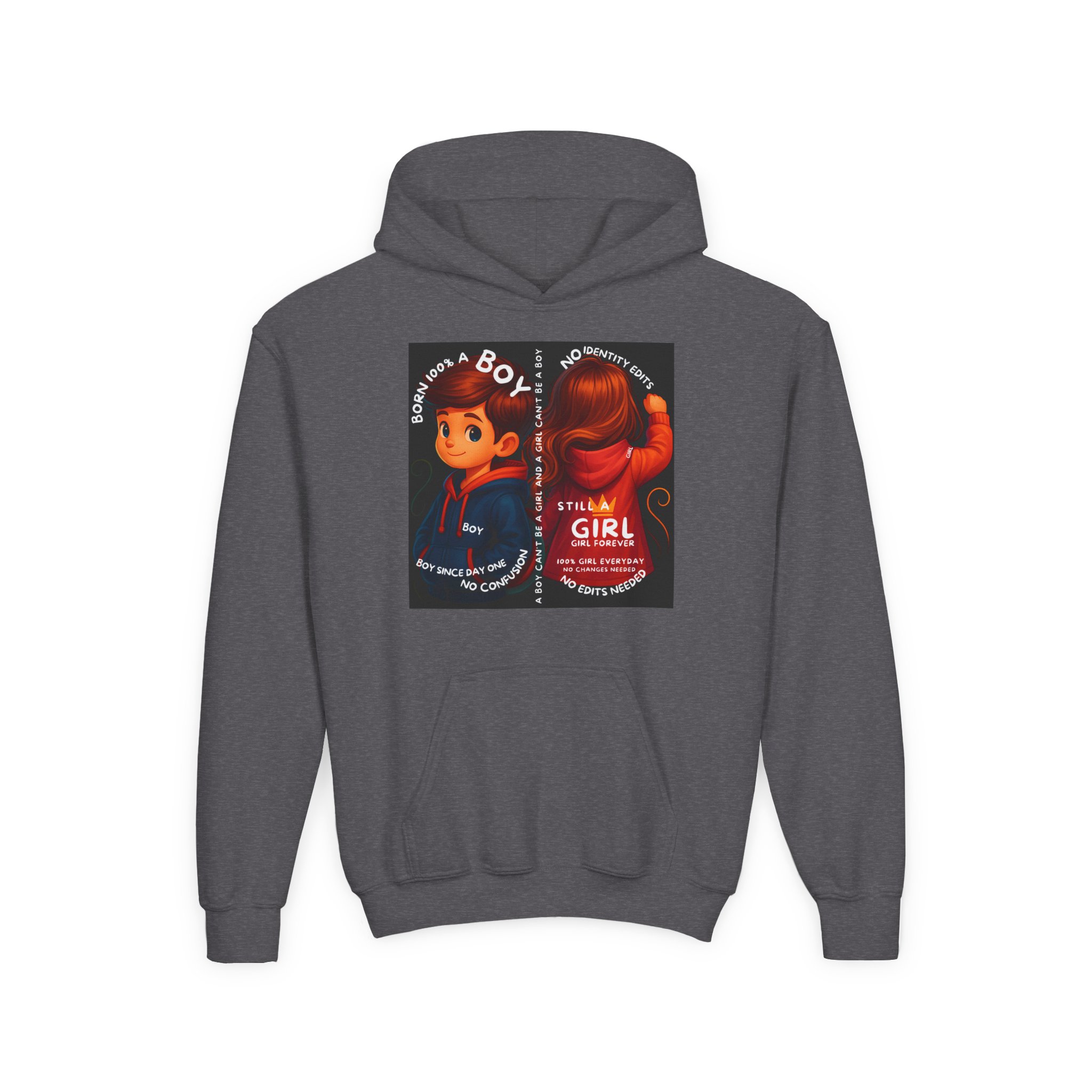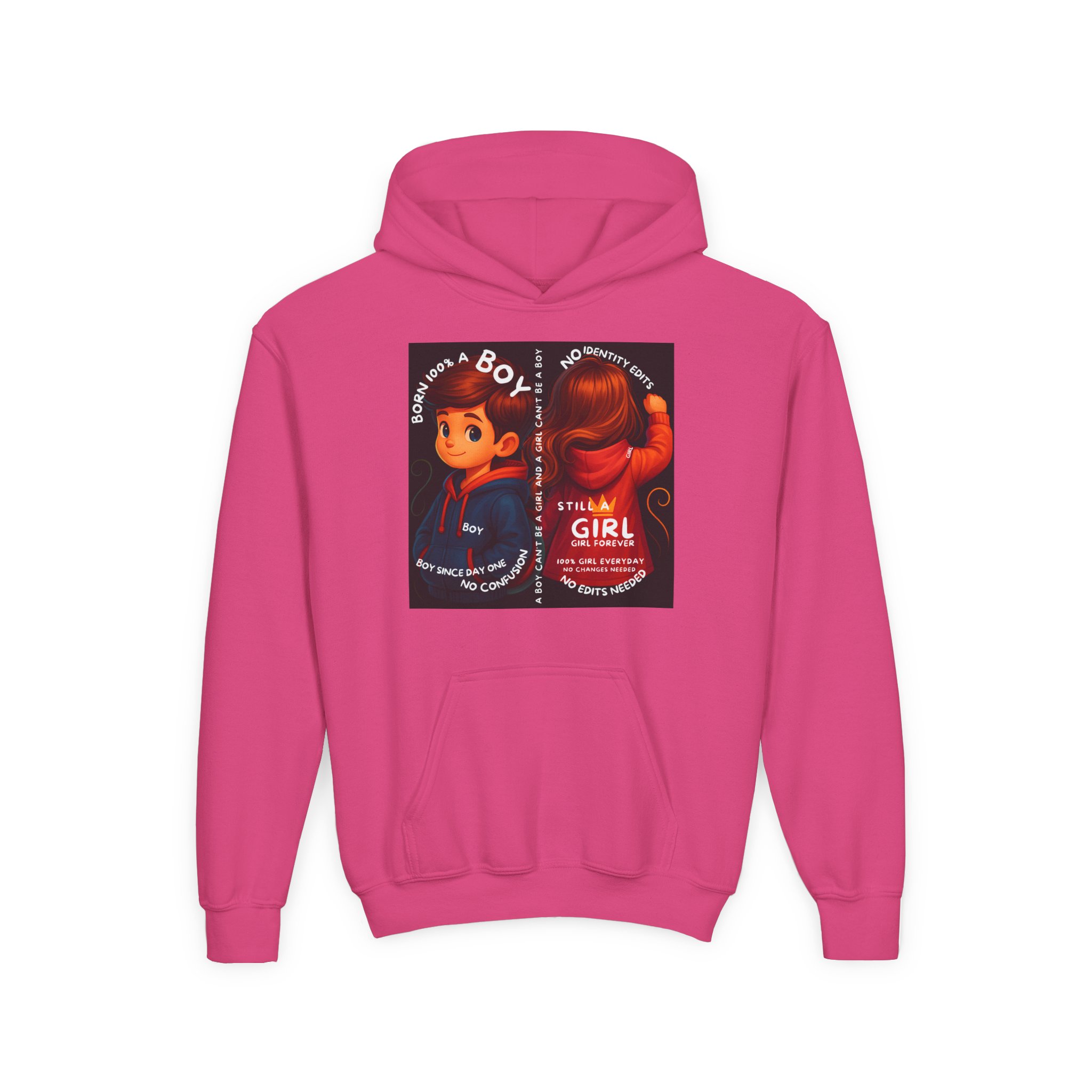 Unisex Kids Hoodie – Sweatshirt, Boy is not a Girl and Girl is not a Boy design, Youth Fashion, Birthday Gift, Everyday Wear. Stay cozy and stylish with this comfortable Youth Heavy Blend Hooded Sweatshirt. Perfect for children, this hoodie features adorable designs that promote fun conversations about identity. Ideal for casual outings, school events, or simply lounging at home, it brings a cheerful vibe to any day. The spacious kangaroo pocket adds a touch of practicality, keeping little hands warm while providing a convenient space for storing small treasures. Great for birthdays, back-to-school, or any celebration where kids want to express themselves! Product features – Twill necktape for comfort and stability – Spacious kangaroo pouch pocket – Durable 50% cotton, 50% polyester blend – Embroidery option available for customization – Regular fit that runs true to size Care instructions – Machine wash: warm (max 40C or 105F) – Bleach as needed – Tumble dry: medium heat – Do not dry clean – Do not iron