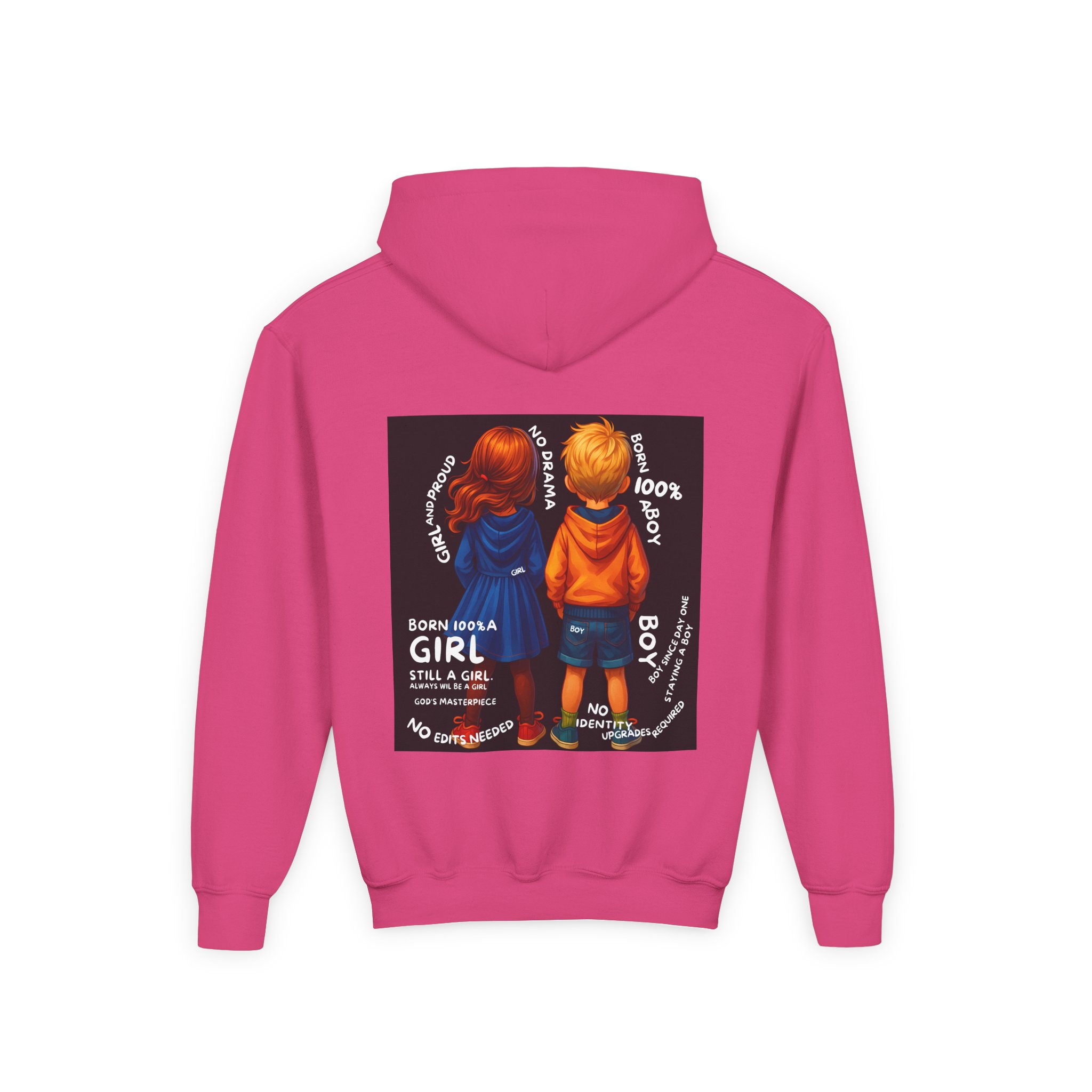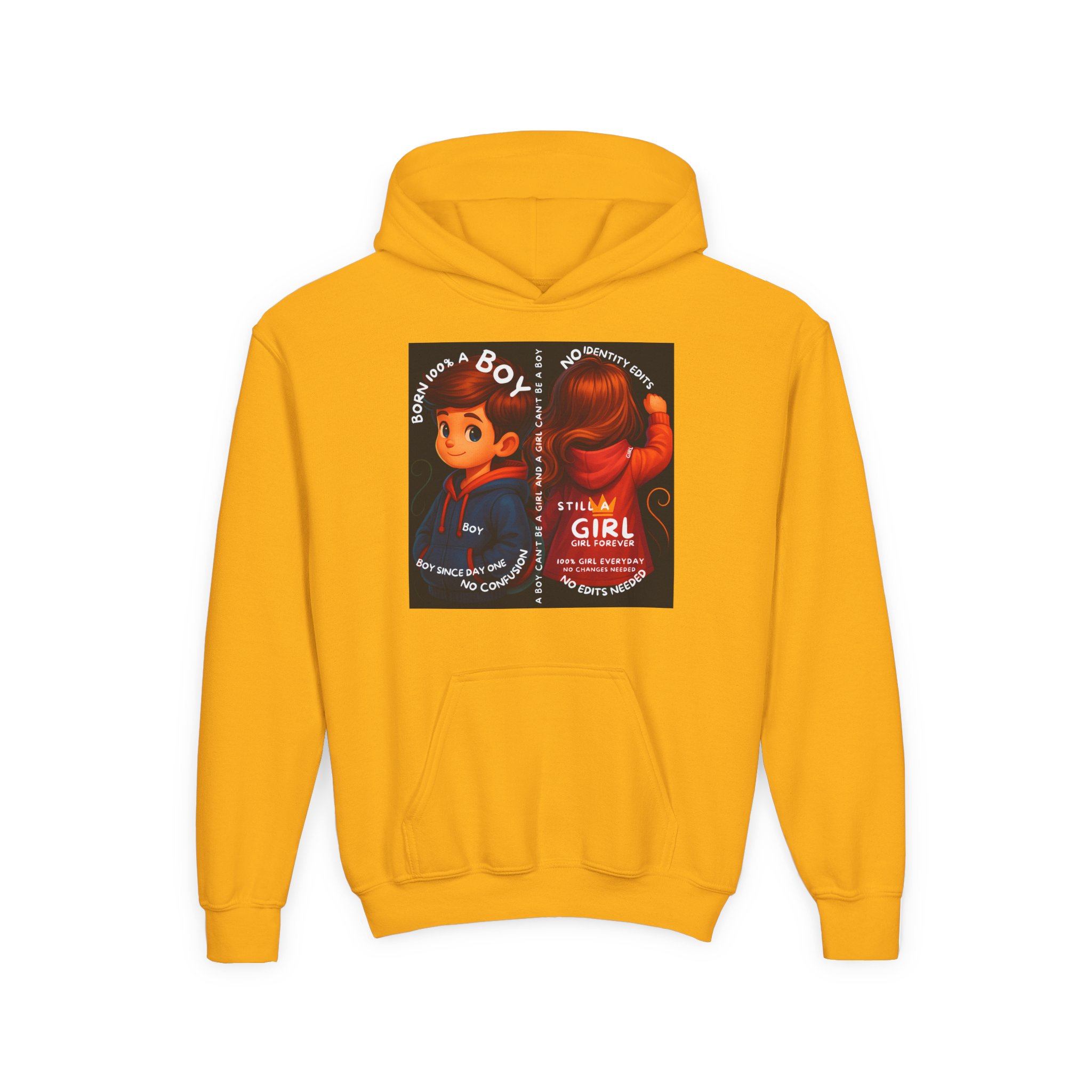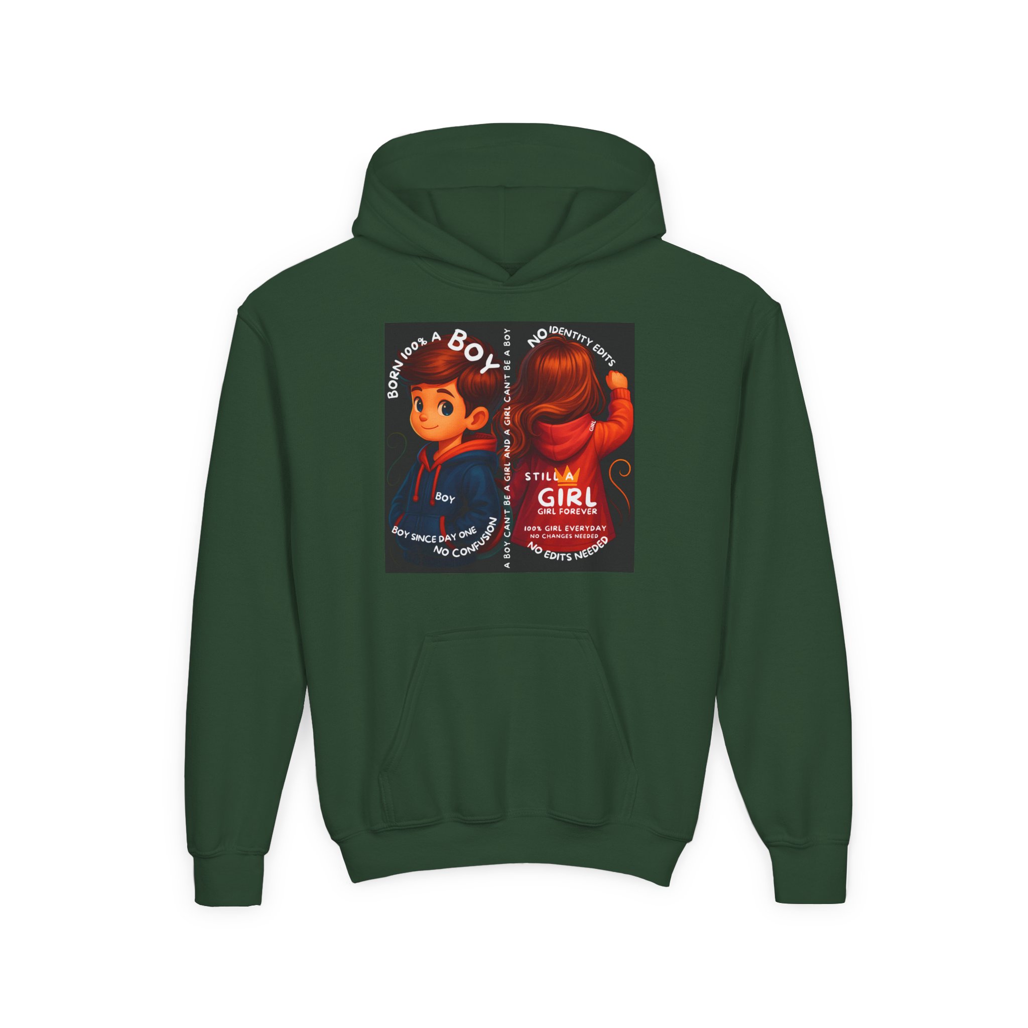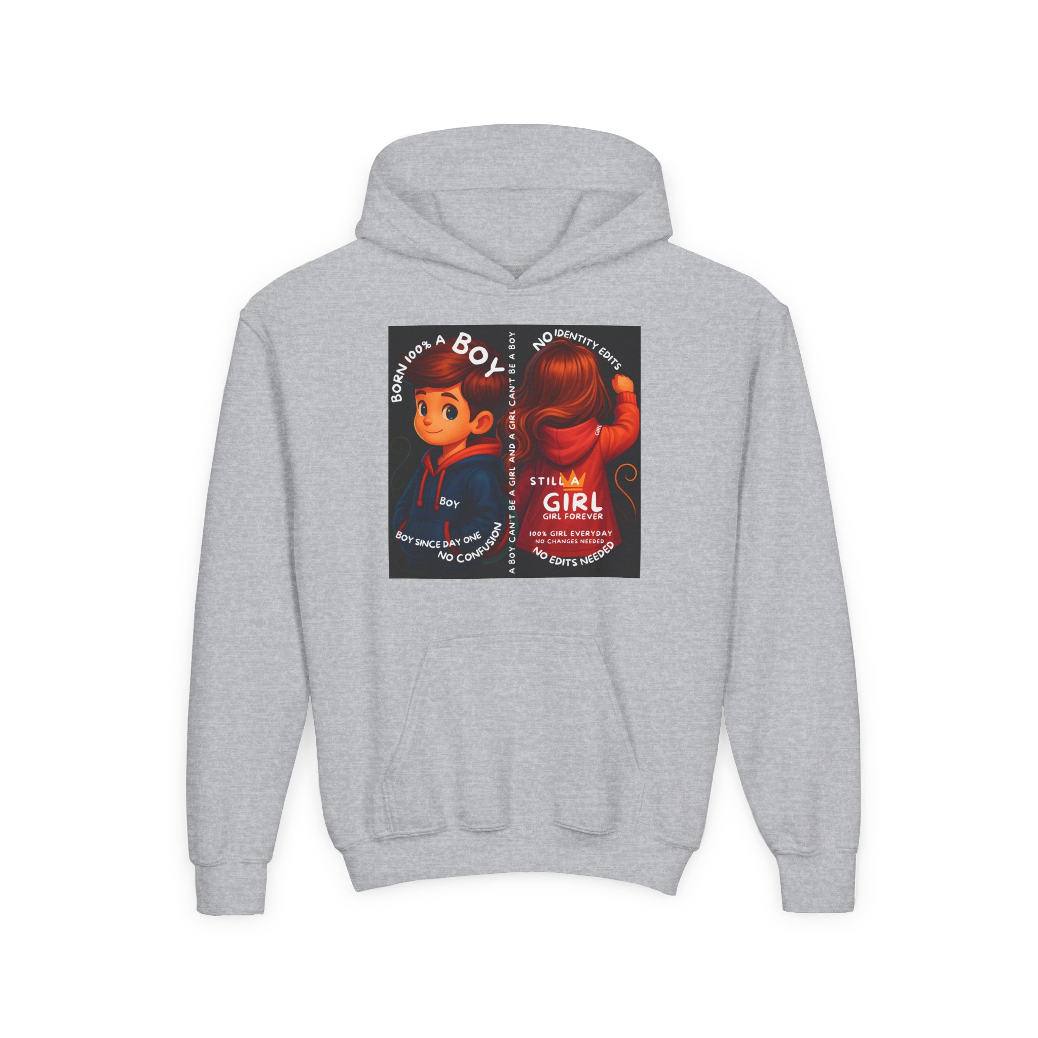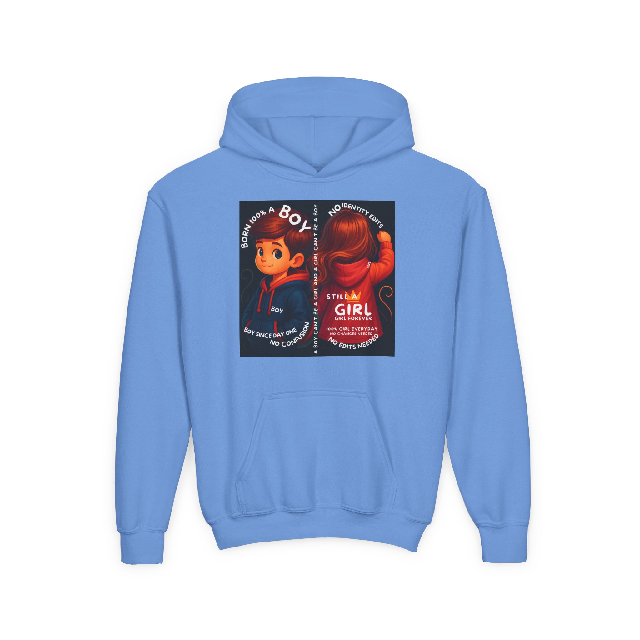 Unisex Kids Hoodie – Sweatshirt, Boy is not a Girl and Girl is not a Boy design, Youth Fashion, Birthday Gift, Everyday Wear. Stay cozy and stylish with this comfortable Youth Heavy Blend Hooded Sweatshirt. Perfect for children, this hoodie features adorable designs that promote fun conversations about identity. Ideal for casual outings, school events, or simply lounging at home, it brings a cheerful vibe to any day. The spacious kangaroo pocket adds a touch of practicality, keeping little hands warm while providing a convenient space for storing small treasures. Great for birthdays, back-to-school, or any celebration where kids want to express themselves! Product features – Twill necktape for comfort and stability – Spacious kangaroo pouch pocket – Durable 50% cotton, 50% polyester blend – Embroidery option available for customization – Regular fit that runs true to size Care instructions – Machine wash: warm (max 40C or 105F) – Bleach as needed – Tumble dry: medium heat – Do not dry clean – Do not iron