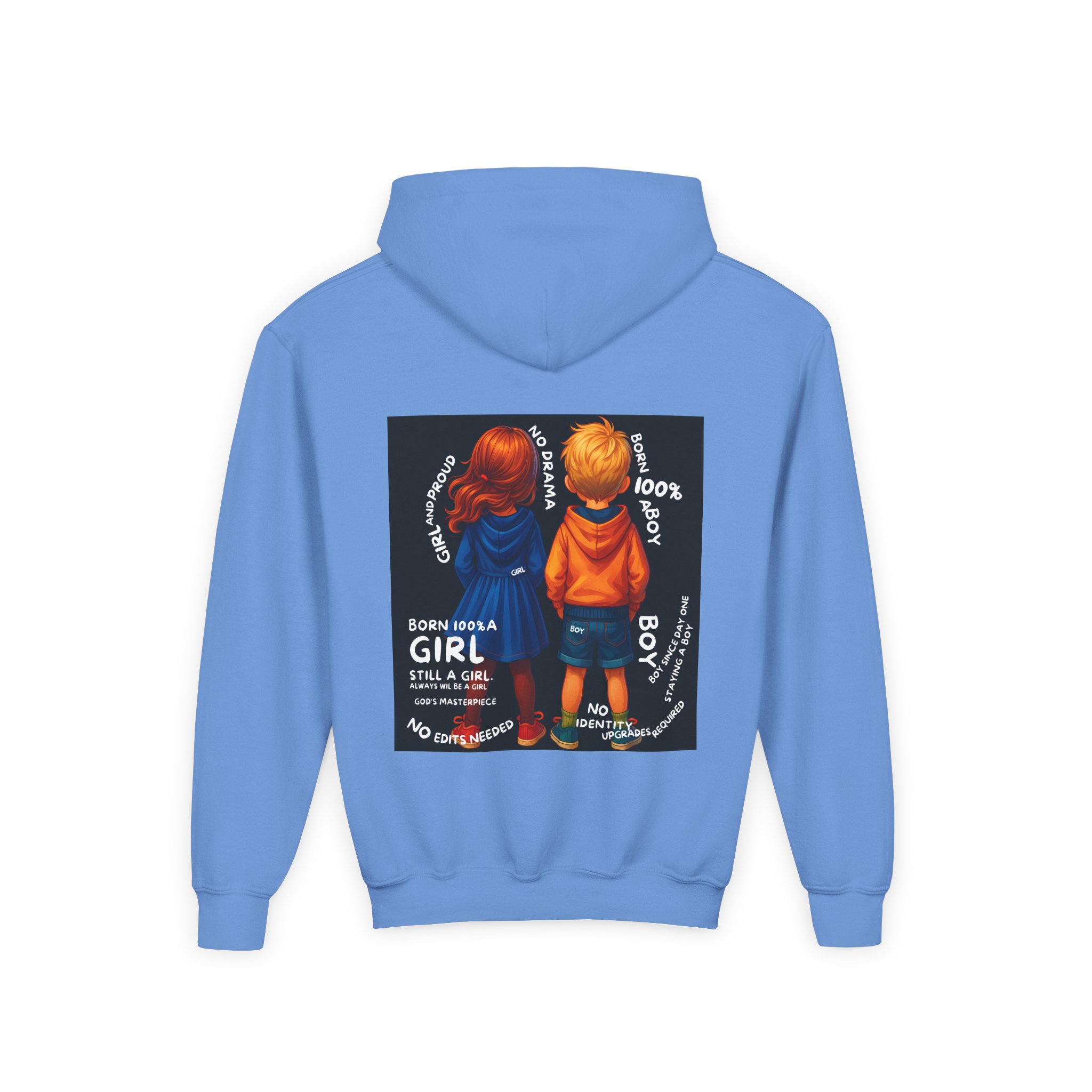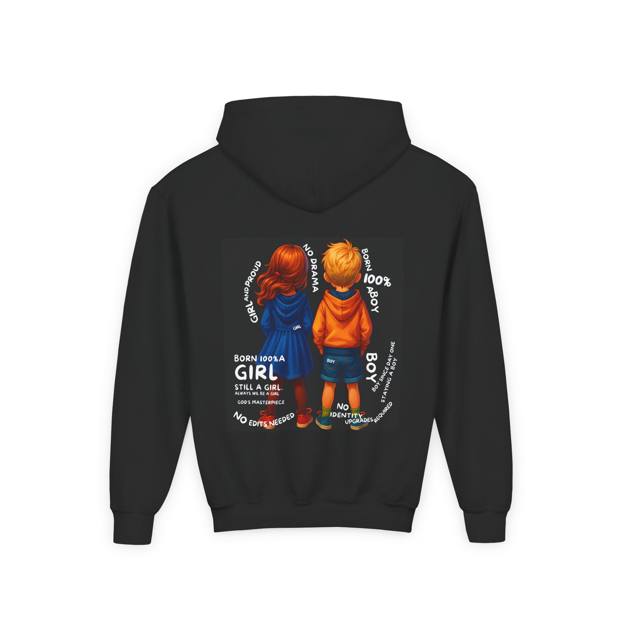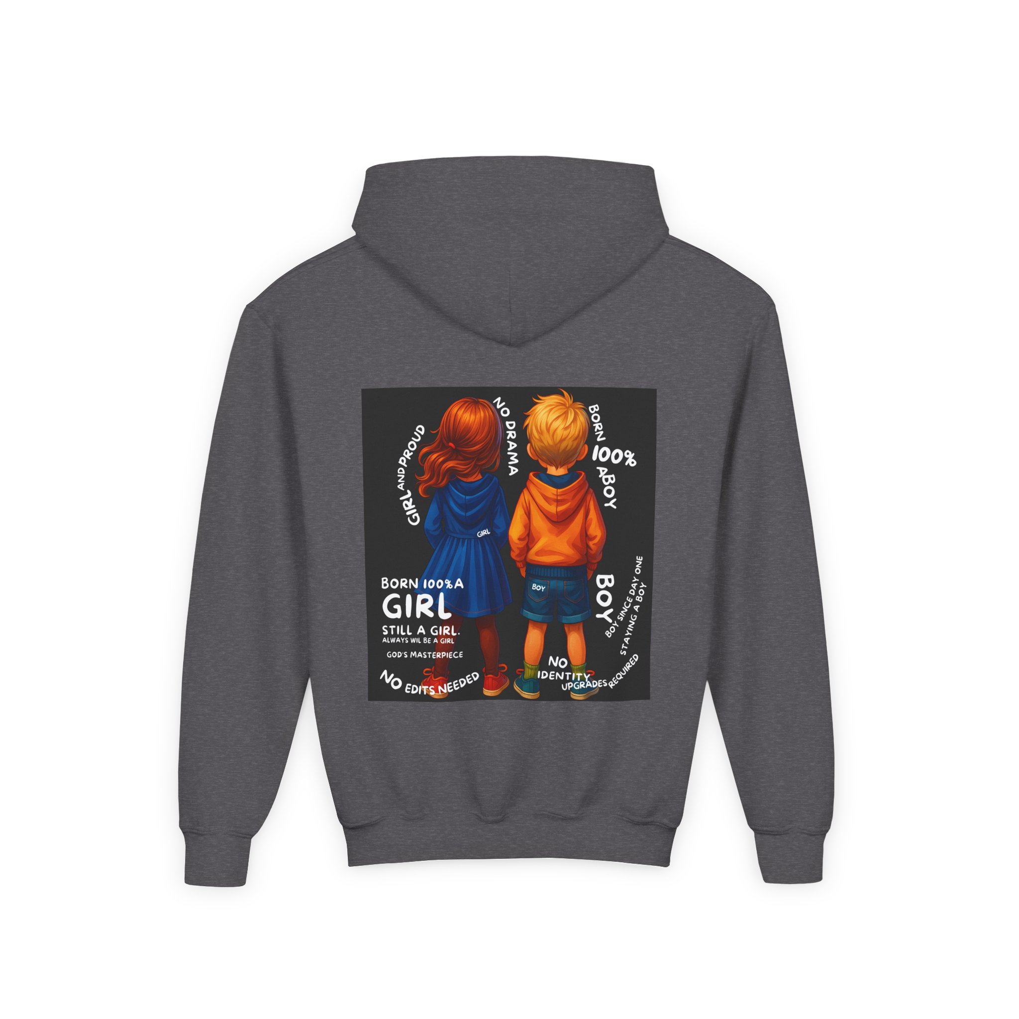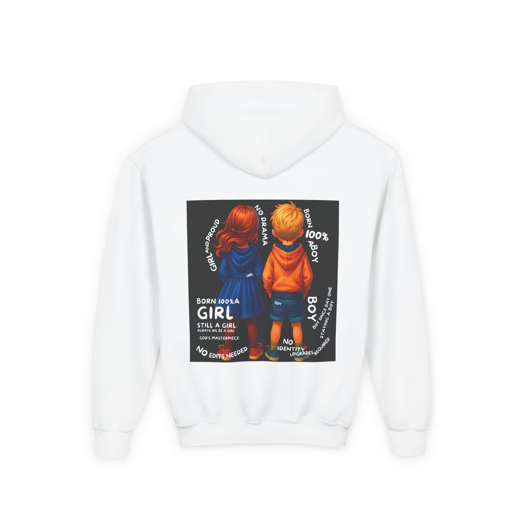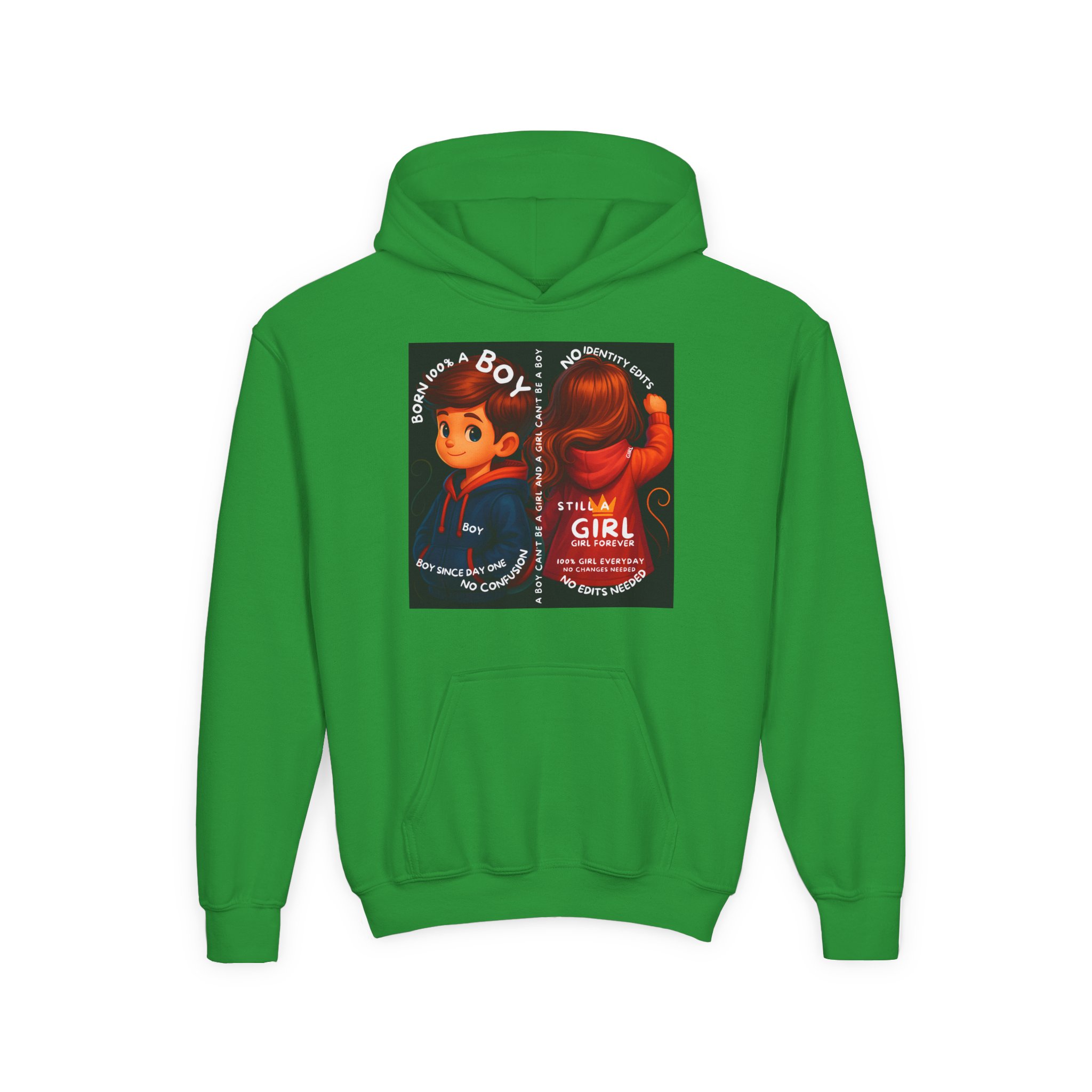 Unisex Kids Hoodie – Sweatshirt, Boy is not a Girl and Girl is not a Boy design, Youth Fashion, Birthday Gift, Everyday Wear. Stay cozy and stylish with this comfortable Youth Heavy Blend Hooded Sweatshirt. Perfect for children, this hoodie features adorable designs that promote fun conversations about identity. Ideal for casual outings, school events, or simply lounging at home, it brings a cheerful vibe to any day. The spacious kangaroo pocket adds a touch of practicality, keeping little hands warm while providing a convenient space for storing small treasures. Great for birthdays, back-to-school, or any celebration where kids want to express themselves! Product features – Twill necktape for comfort and stability – Spacious kangaroo pouch pocket – Durable 50% cotton, 50% polyester blend – Embroidery option available for customization – Regular fit that runs true to size Care instructions – Machine wash: warm (max 40C or 105F) – Bleach as needed – Tumble dry: medium heat – Do not dry clean – Do not iron