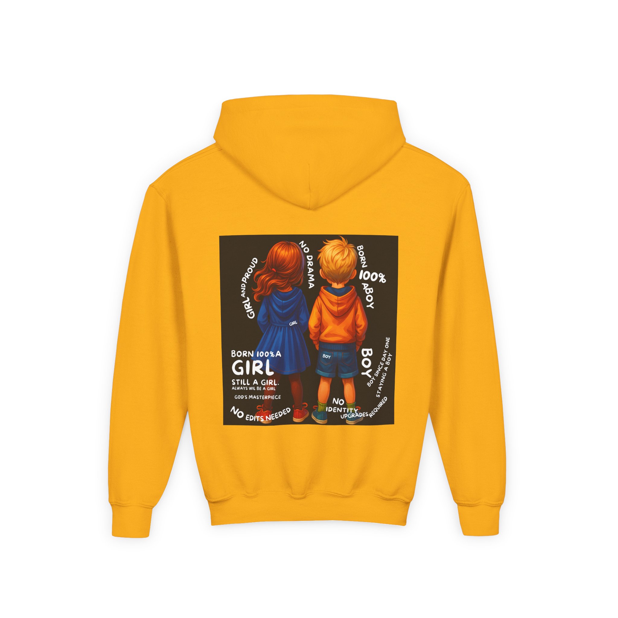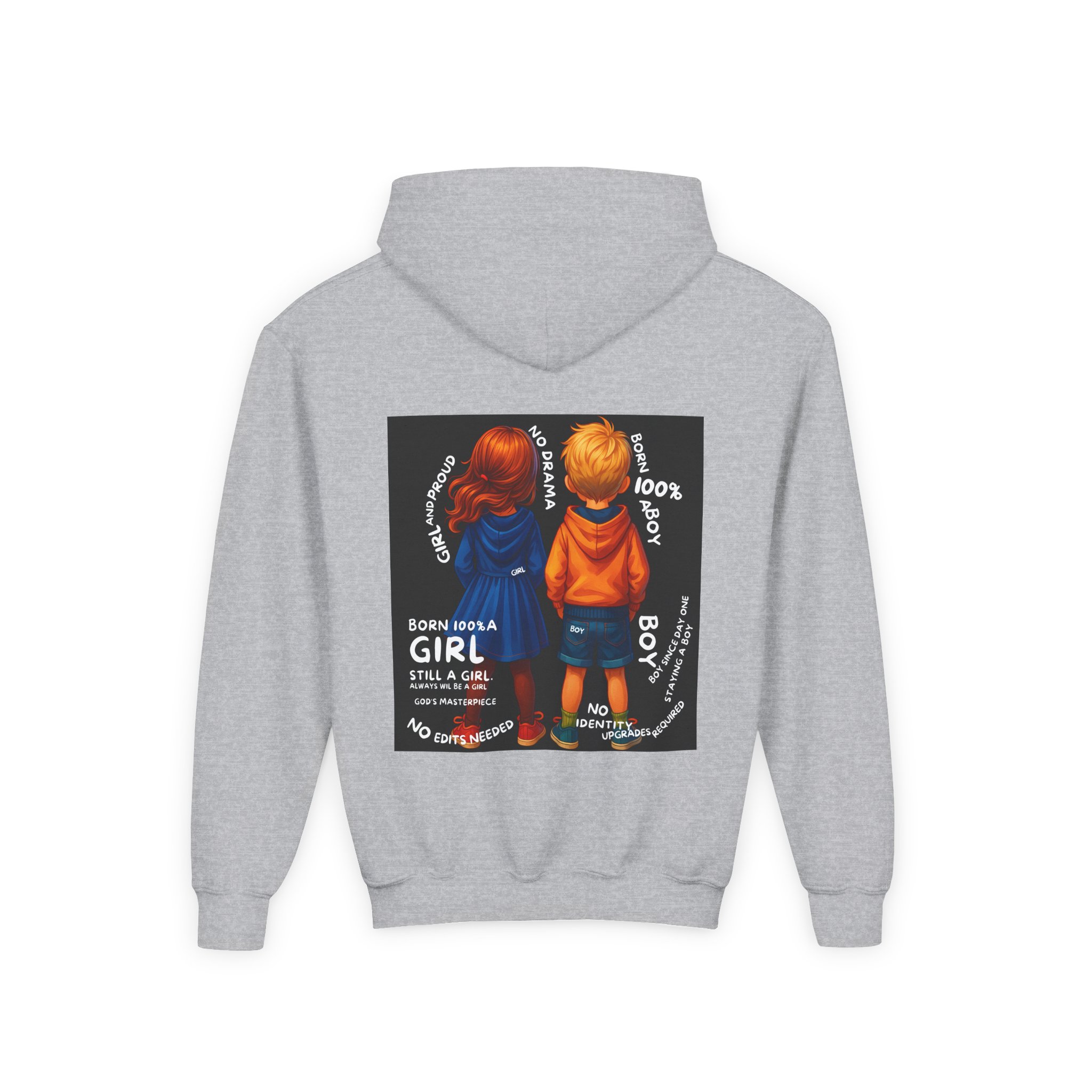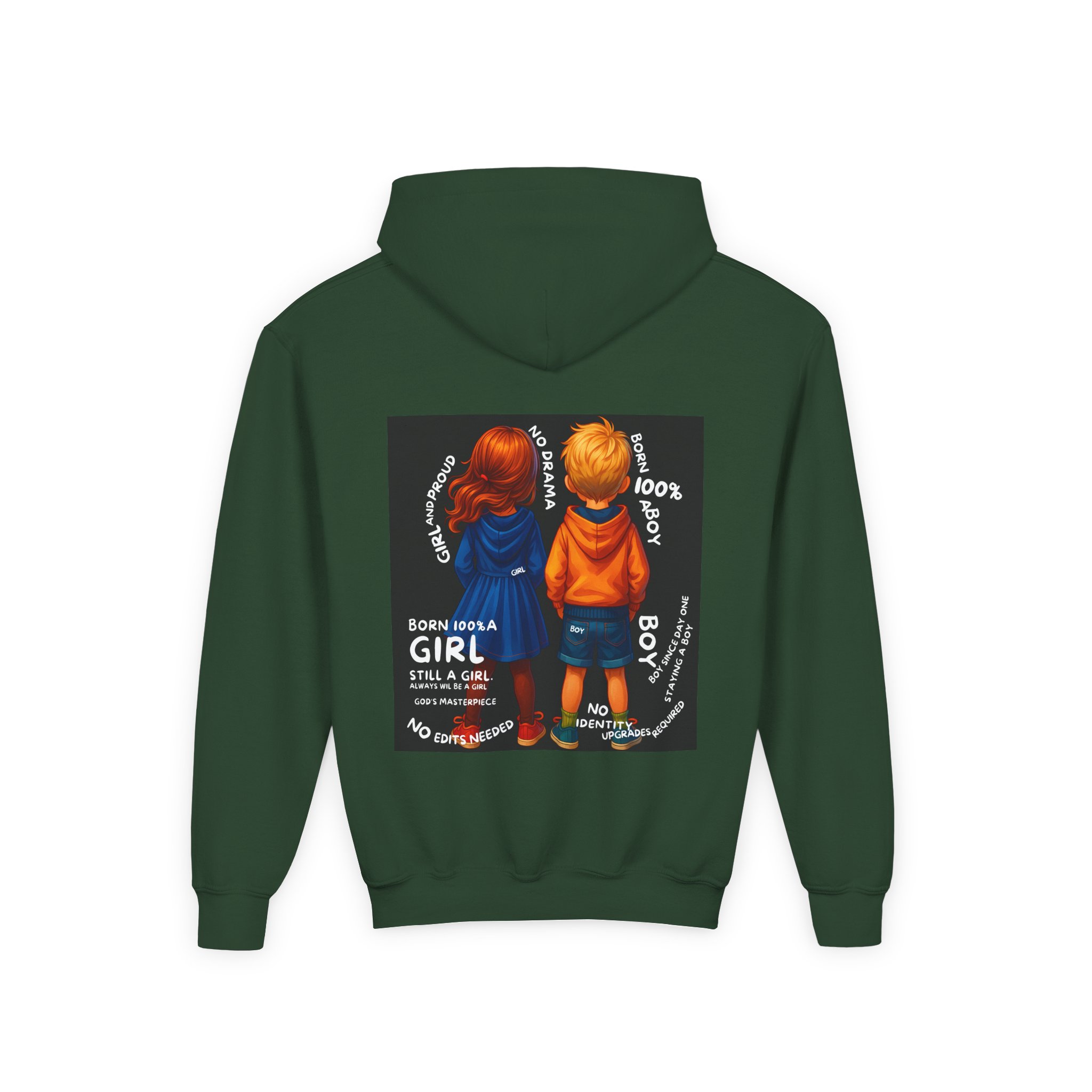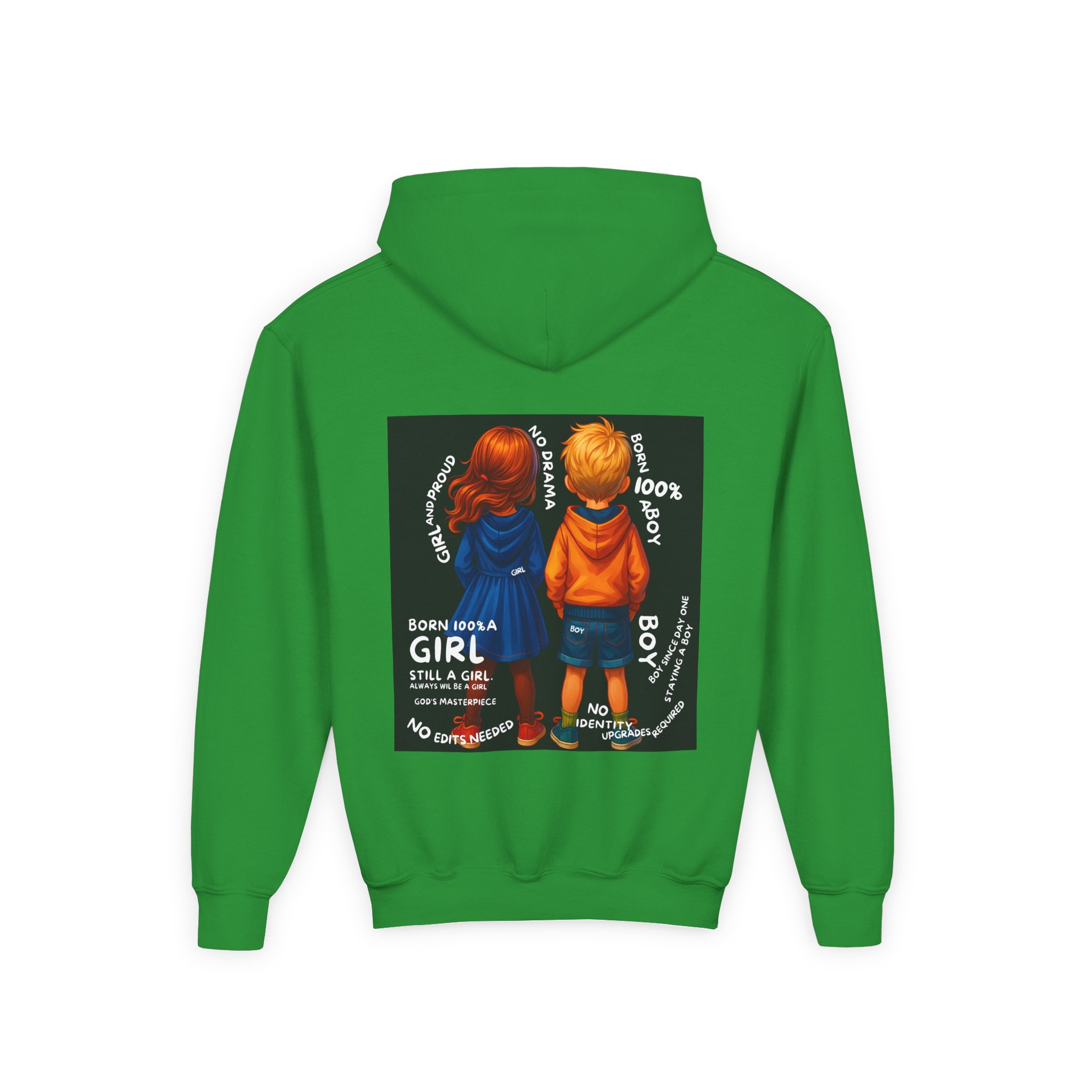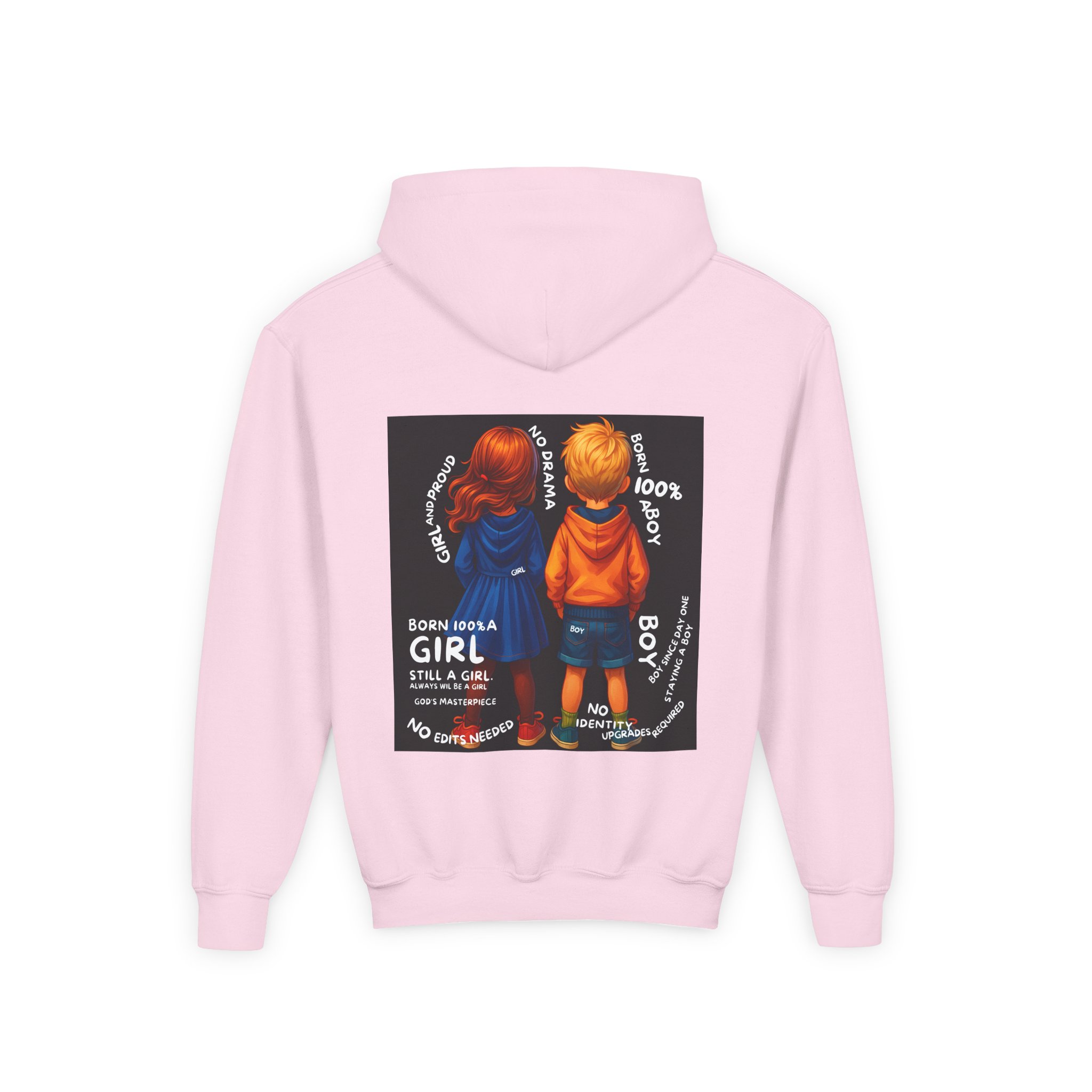 Unisex Kids Hoodie – Sweatshirt, Boy is not a Girl and Girl is not a Boy design, Youth Fashion, Birthday Gift, Everyday Wear. Stay cozy and stylish with this comfortable Youth Heavy Blend Hooded Sweatshirt. Perfect for children, this hoodie features adorable designs that promote fun conversations about identity. Ideal for casual outings, school events, or simply lounging at home, it brings a cheerful vibe to any day. The spacious kangaroo pocket adds a touch of practicality, keeping little hands warm while providing a convenient space for storing small treasures. Great for birthdays, back-to-school, or any celebration where kids want to express themselves! Product features – Twill necktape for comfort and stability – Spacious kangaroo pouch pocket – Durable 50% cotton, 50% polyester blend – Embroidery option available for customization – Regular fit that runs true to size Care instructions – Machine wash: warm (max 40C or 105F) – Bleach as needed – Tumble dry: medium heat – Do not dry clean – Do not iron