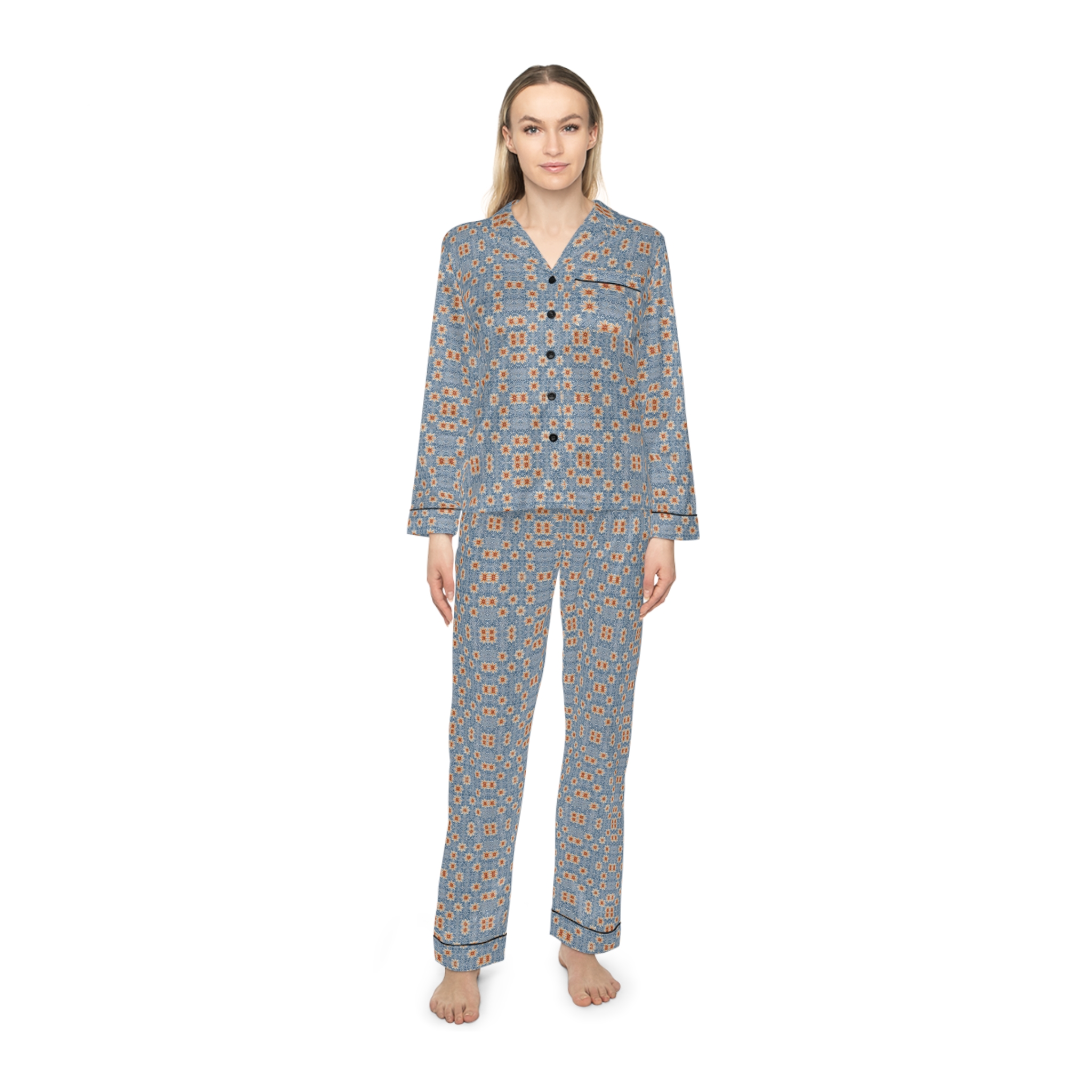 Experience unmatched comfort and elevated design with Hampton Laze designer pyjamas (also known as pajamas). Crafted from a premium satin blend of 95% polyester and 5% spandex, these limited-edition sets feel luxuriously smooth against the skin. Each set features a refined notch lapel collar, black trim details, and a drawstring waist for a tailored yet relaxed fit. Every design is exclusive to Hampton Laze — bold, timeless, and never mass-produced. Perfect for women who value originality, softness, and style, whether lounging or traveling.