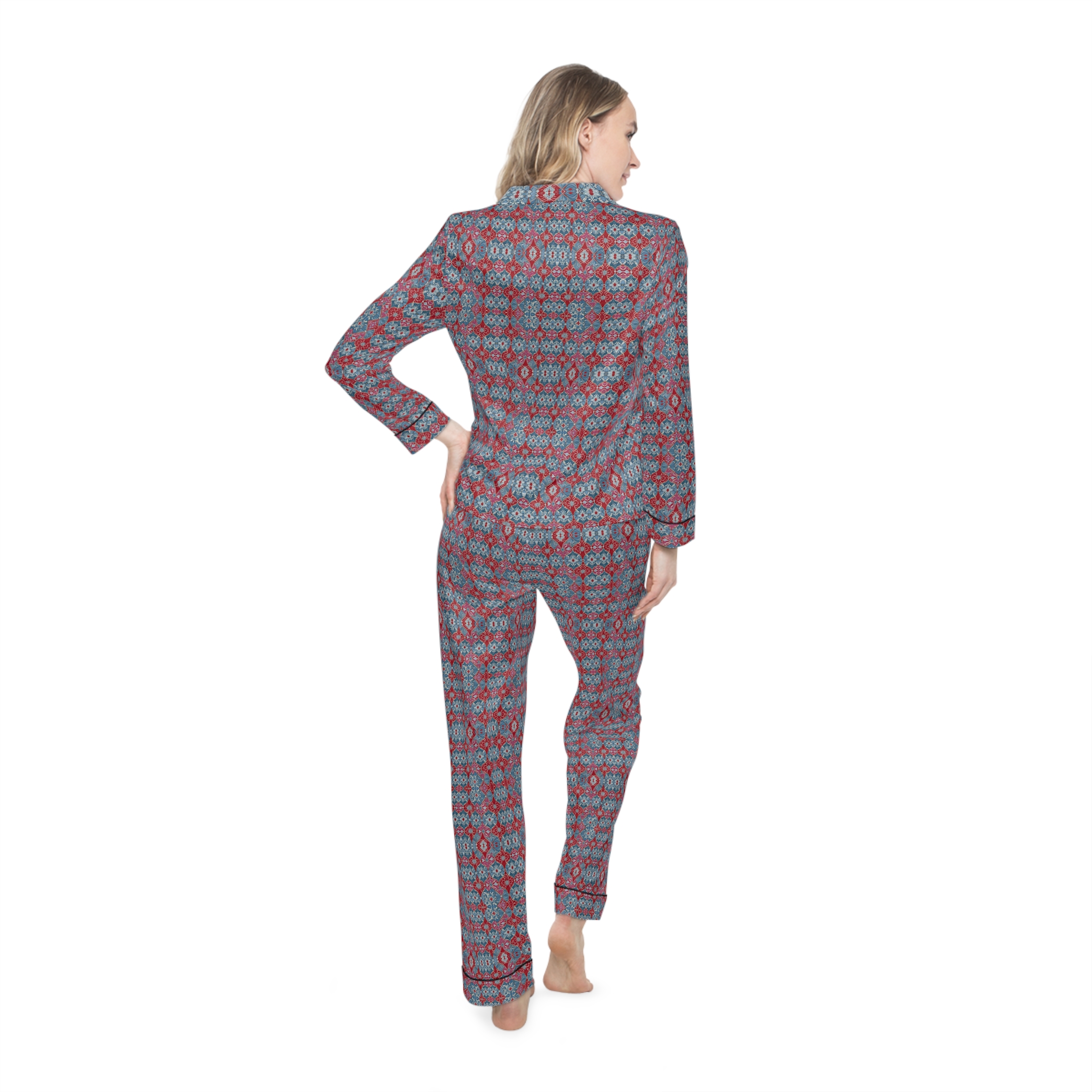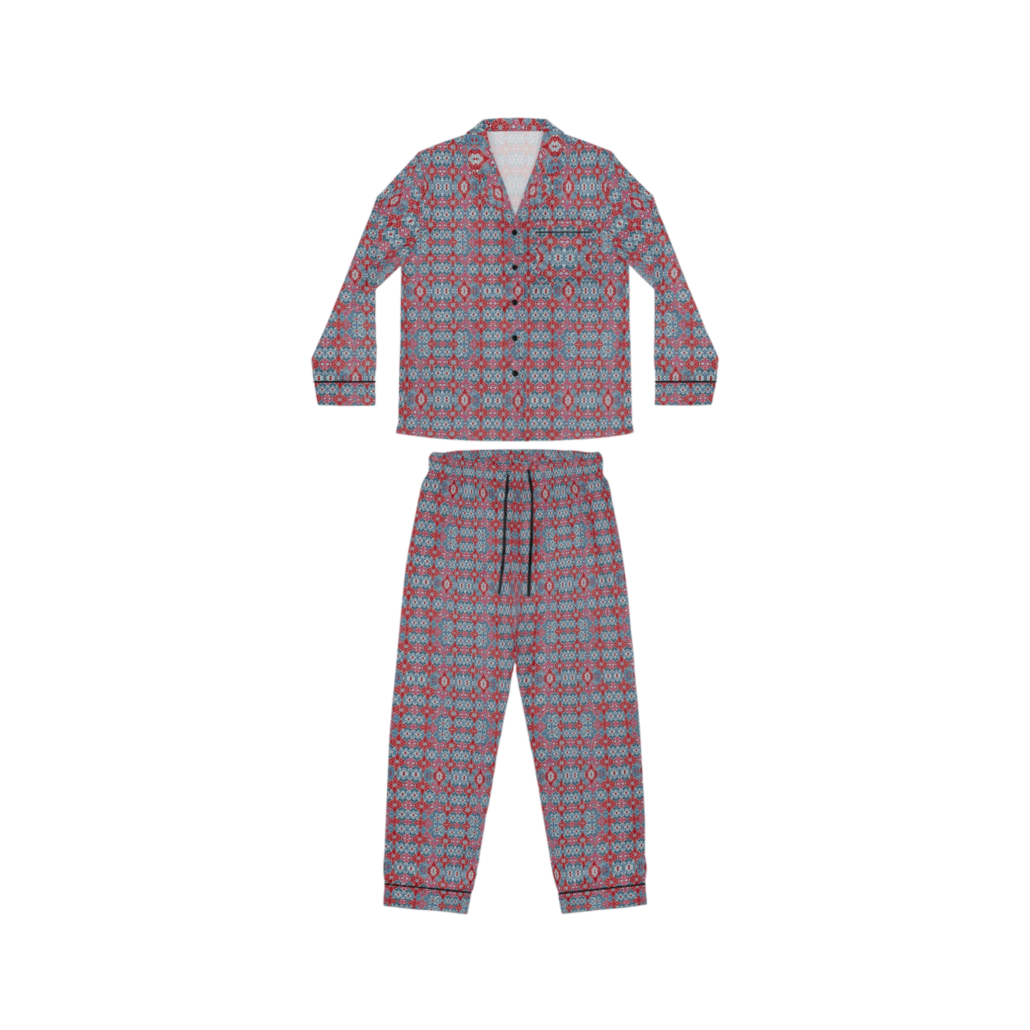 Experience unmatched comfort and elevated design with Hampton Laze designer pyjamas (also known as pajamas). Crafted from a premium satin blend of 95% polyester and 5% spandex, these limited-edition sets feel luxuriously smooth against the skin. Each set features a refined notch lapel collar, black trim details, and a drawstring waist for a tailored yet relaxed fit. Every design is exclusive to Hampton Laze — bold, timeless, and never mass-produced. Perfect for women who value originality, softness, and style, whether lounging or traveling.