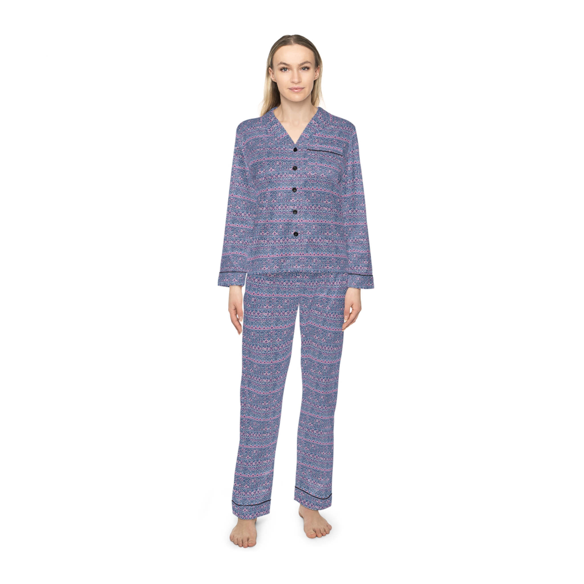Experience unmatched comfort and elevated design with Hampton Laze designer pyjamas (also known as pajamas). Crafted from a premium satin blend of 95% polyester and 5% spandex, these limited-edition sets feel luxuriously smooth against the skin. Each set features a refined notch lapel collar, black trim details, and a drawstring waist for a tailored yet relaxed fit. Every design is exclusive to Hampton Laze — bold, timeless, and never mass-produced. Perfect for women who value originality, softness, and style, whether lounging or traveling.
