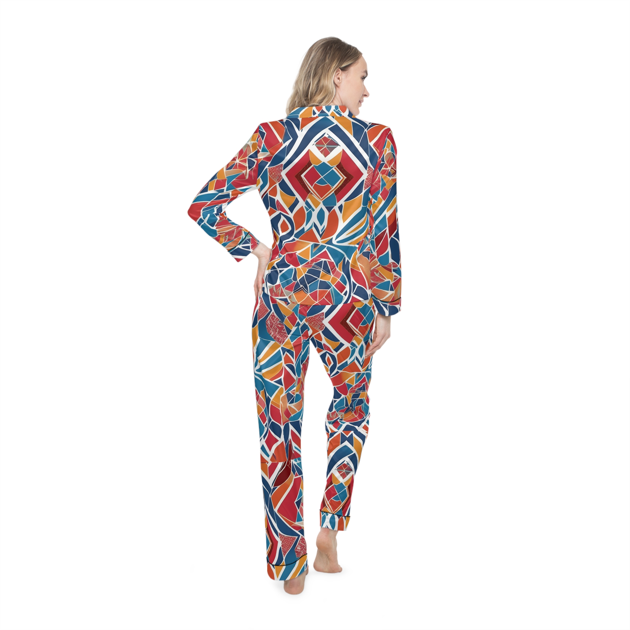 Experience unmatched comfort and elevated design with Hampton Laze designer pyjamas (also known as pajamas). Crafted from a premium satin blend of 95% polyester and 5% spandex, these limited-edition sets feel luxuriously smooth against the skin. Each set features a refined notch lapel collar, black trim details, and a drawstring waist for a tailored yet relaxed fit. Every design is exclusive to Hampton Laze — bold, timeless, and never mass-produced. Perfect for women who value originality, softness, and style, whether lounging or traveling.